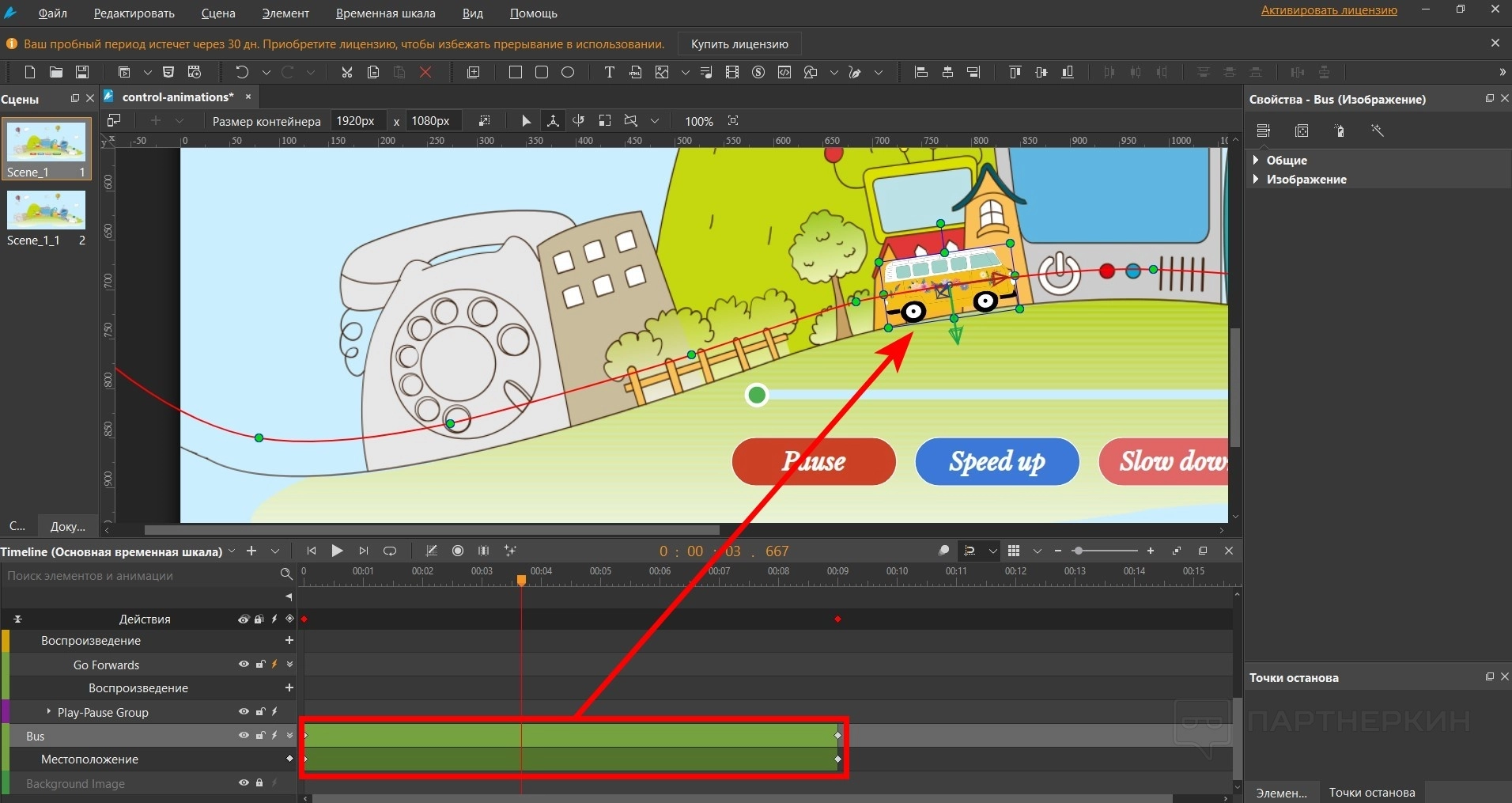 То есть работает это как в обычной мультипликации. На примере автобуса из скриншотов можно понять, что объект движется по определенной линии (покадрово). При этом на таймлайне у него есть начальная координата и конечная. Между ними есть плавный переход.
