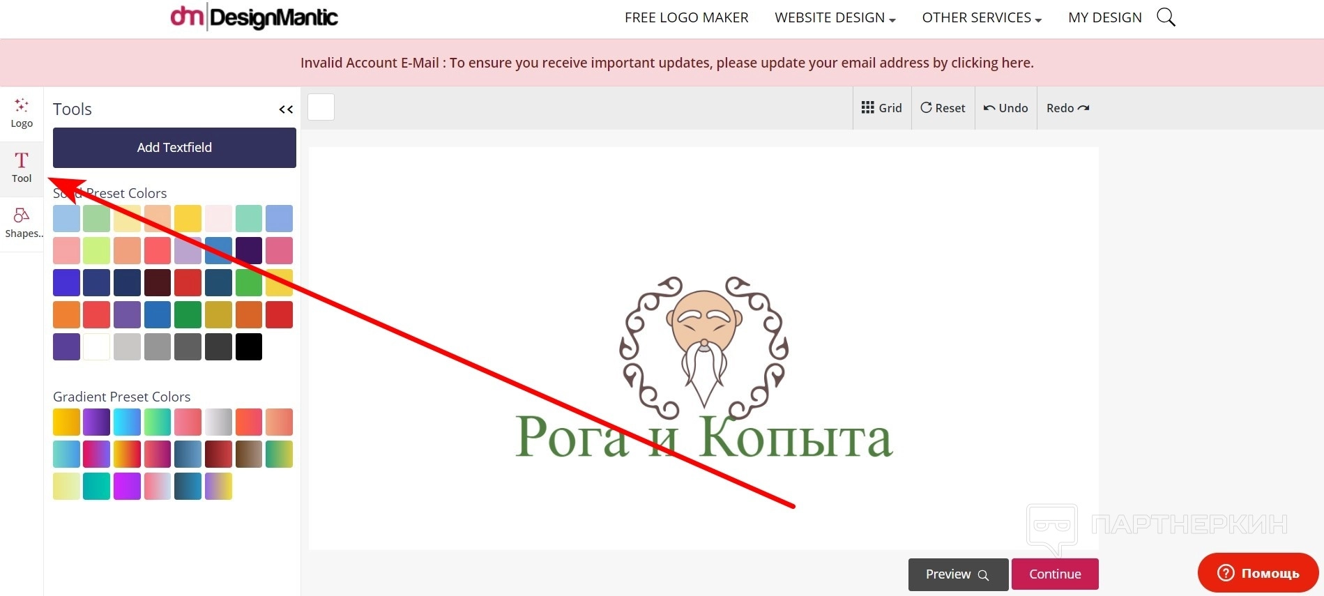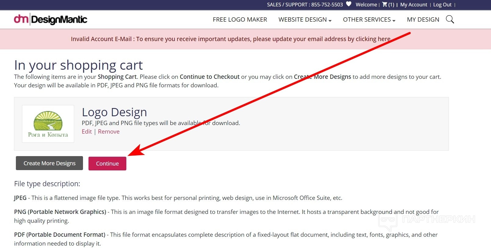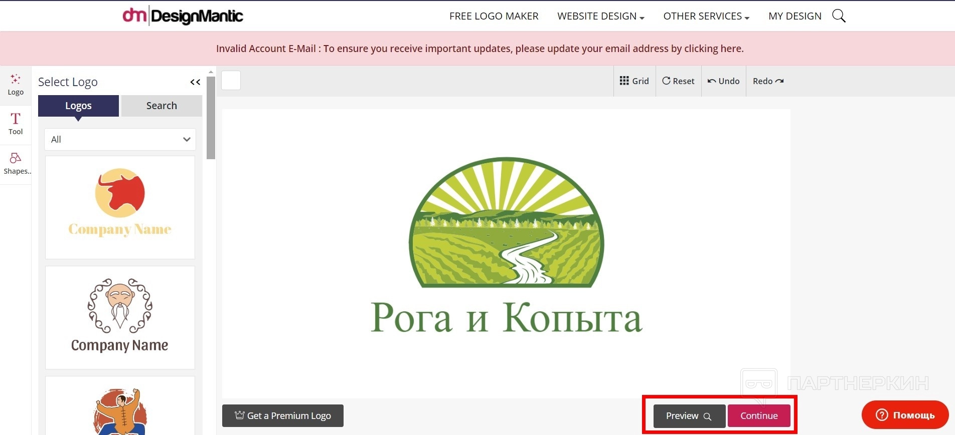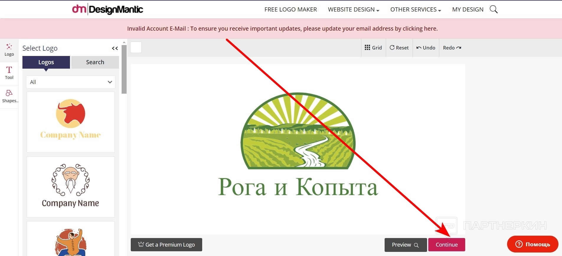 - В конструкторе нажмите на кнопку Continue . Логотип сохранится в личном кабинете.
