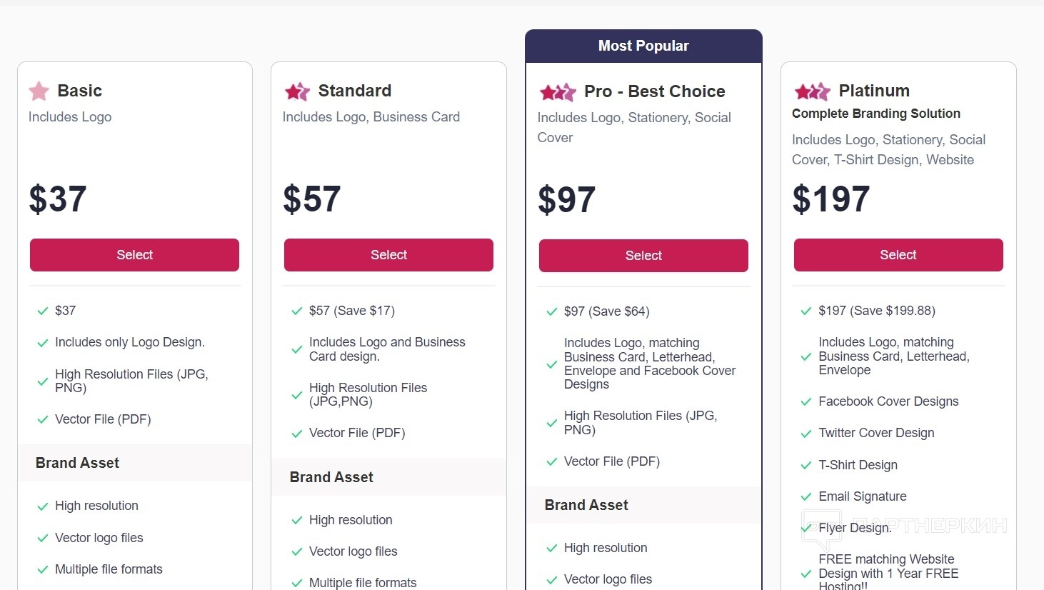 - Platinum. Включает логотип, канцелярские принадлежности, социальную обложку, дизайн футболки, веб-сайт.