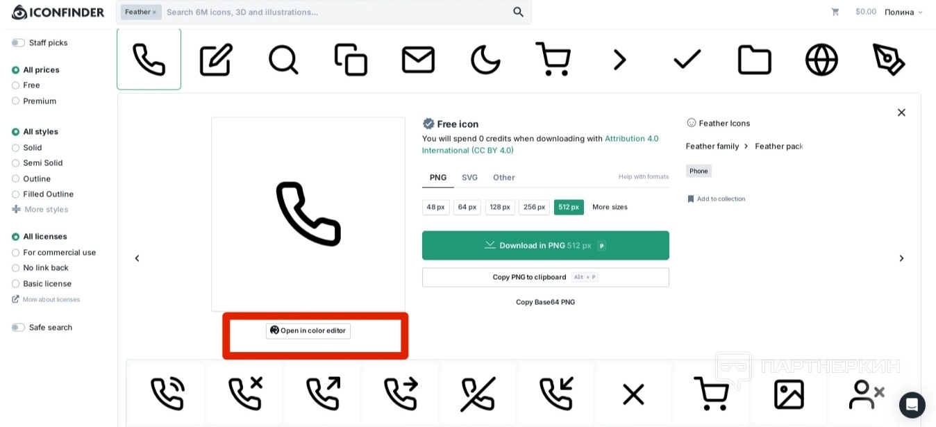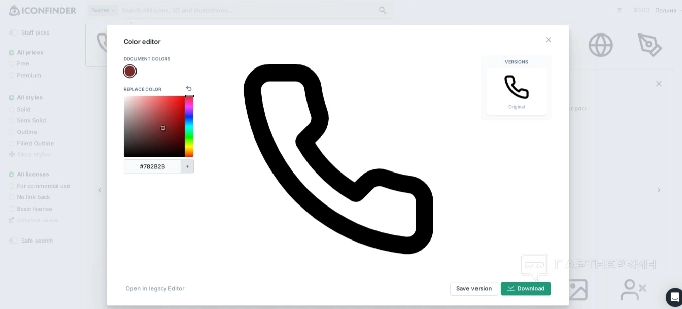 После настроек цвета или выбора готовой иконки пользователь может добавить ее в корзину для оплаты позднее или оплатить и скачать сразу. На некоторых иконках видны водяные знаки — убираются они только при наличии платного тарифа.