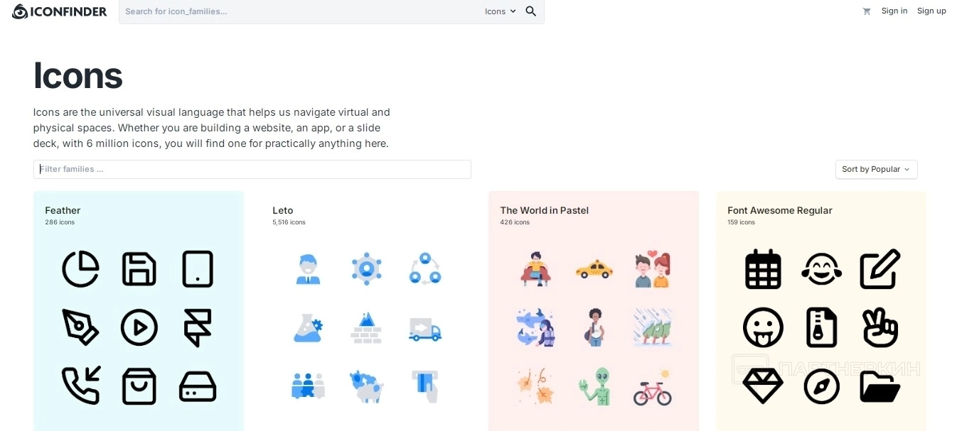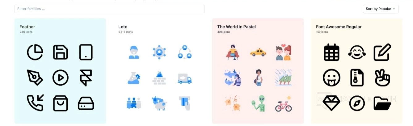 1 этап . С главного экрана сервиса нажимаем на раздел Icons или вводим необходимую подсказку в поисковую строку. Система перебрасывает пользователя на библиотеку готовых наборов иконок от разных авторов, где достаточно нажать на понравившийся.