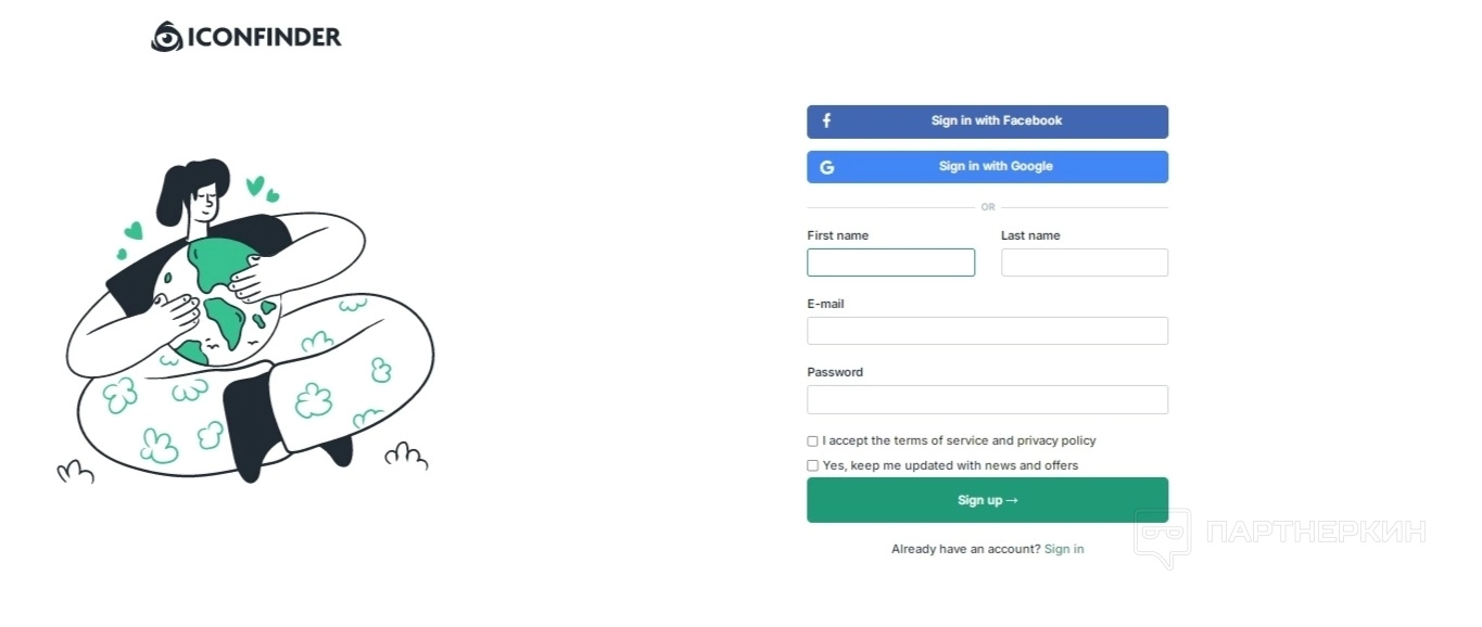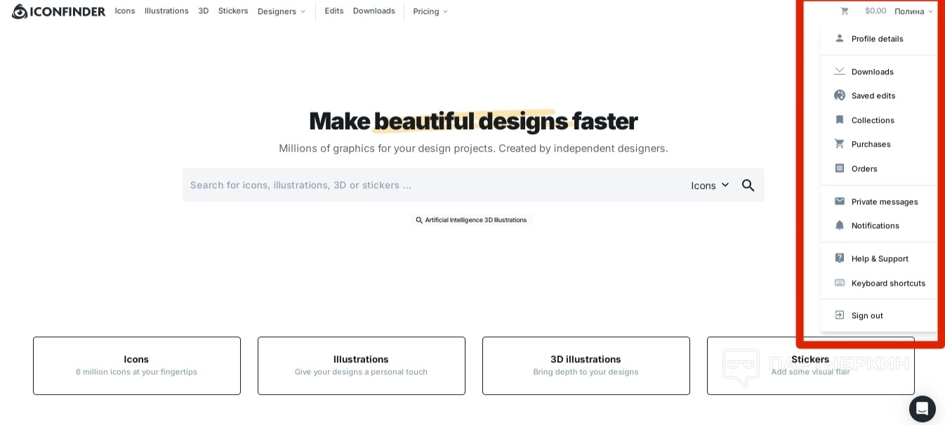 Дополнительных подтверждений Iconfinder не требует, начинать работу можно практически сразу после этого шага.