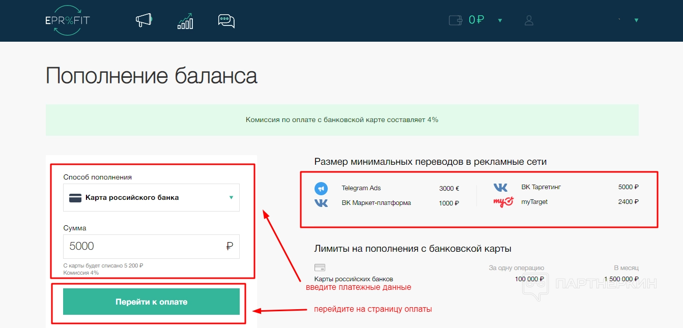 Для работы с рекламными кабинетами требуется пополнить баланс на минимальную сумму: