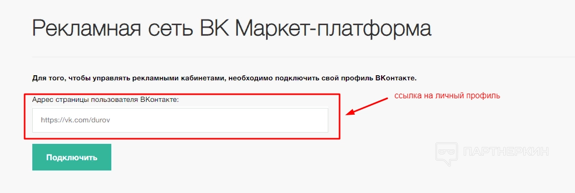 Чтобы подключить рекламный кабинет ВКонтакте, требуется указать ссылку на личный профиль и нажать «Подключить». После привязки появится список всех рекламных кабинетов, созданных в ВК.