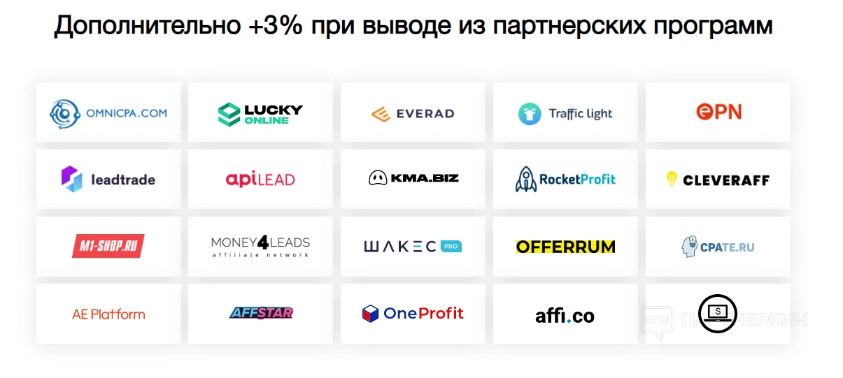 Также сайт дополнительно дает +3% при выводе средств через партнерские сервисы. Среди них – EPN, TrafficLight, Omnicpa.com, API Lead, Leadtrade, Rocket Profit, Cleveraff, M1Shop.ru, Money4Leads и др.