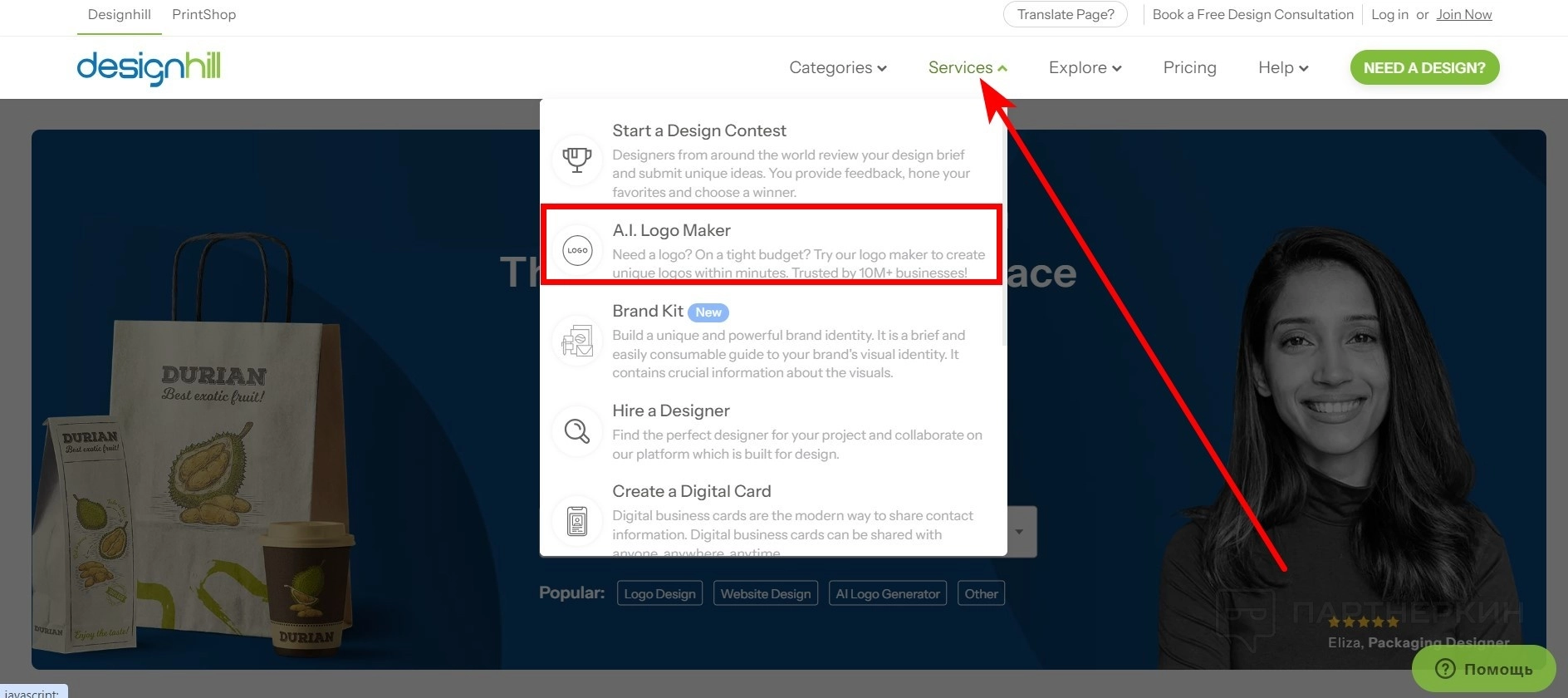 Чтобы использовать данный инструмент, нужно перейти на главной странице официального сайта в раздел A.I. Logo Maker . При этом пользователь должен быть зарегистрированным пользователем платформы Designhill.