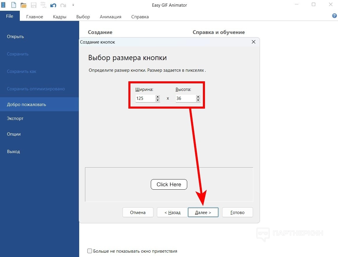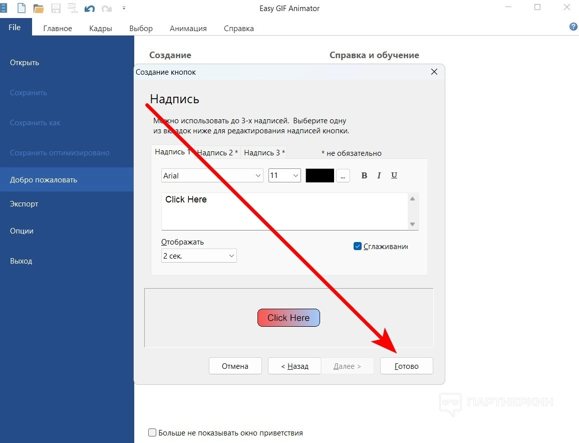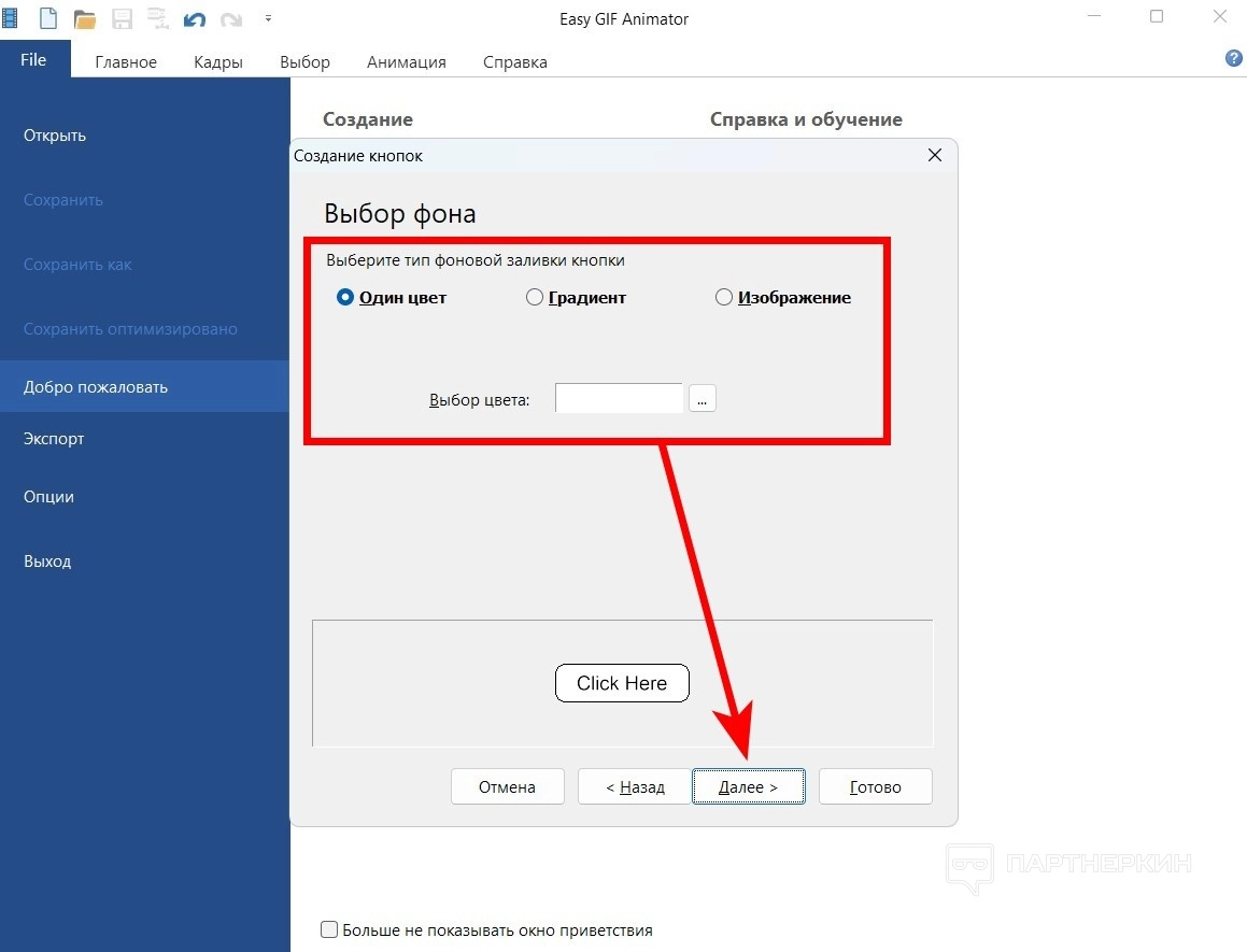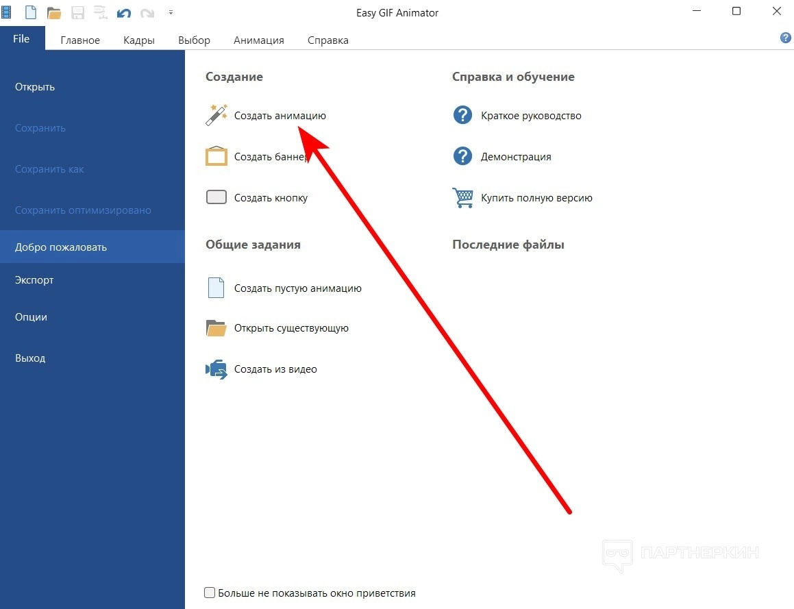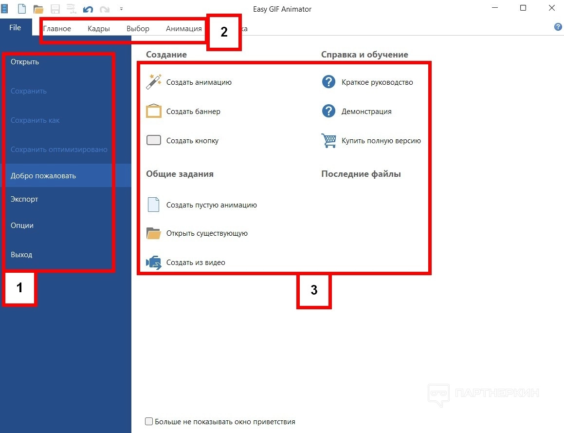 - Инструмент для запуска. В программе можно создать анимацию, баннер или анимированную кнопку. Также можно сгенерировать отдельный кадр анимации или открыть предыдущий проект (3).