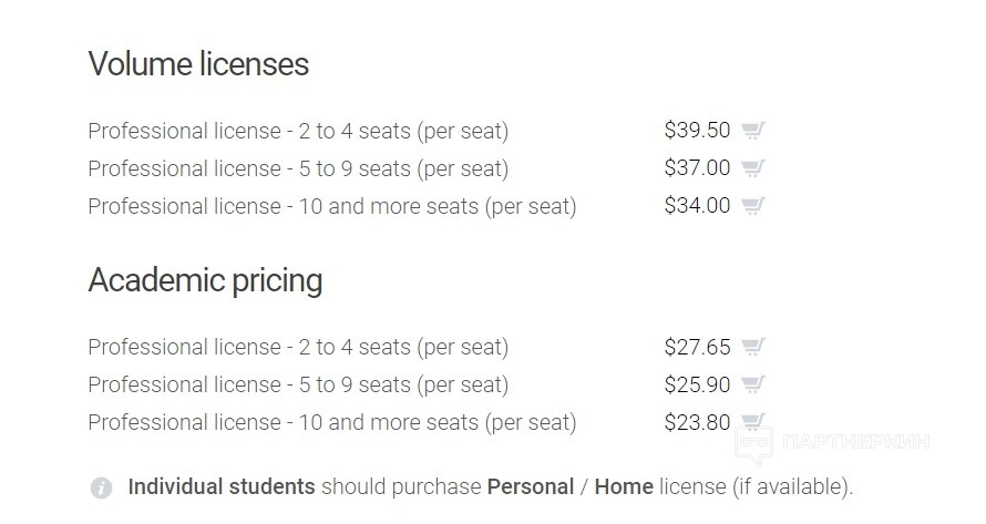 Стоимость для корпоративных лицензий варьируется в пределах $34-39. Академическая лицензия стоит $23-27. Все зависит от количества мест.