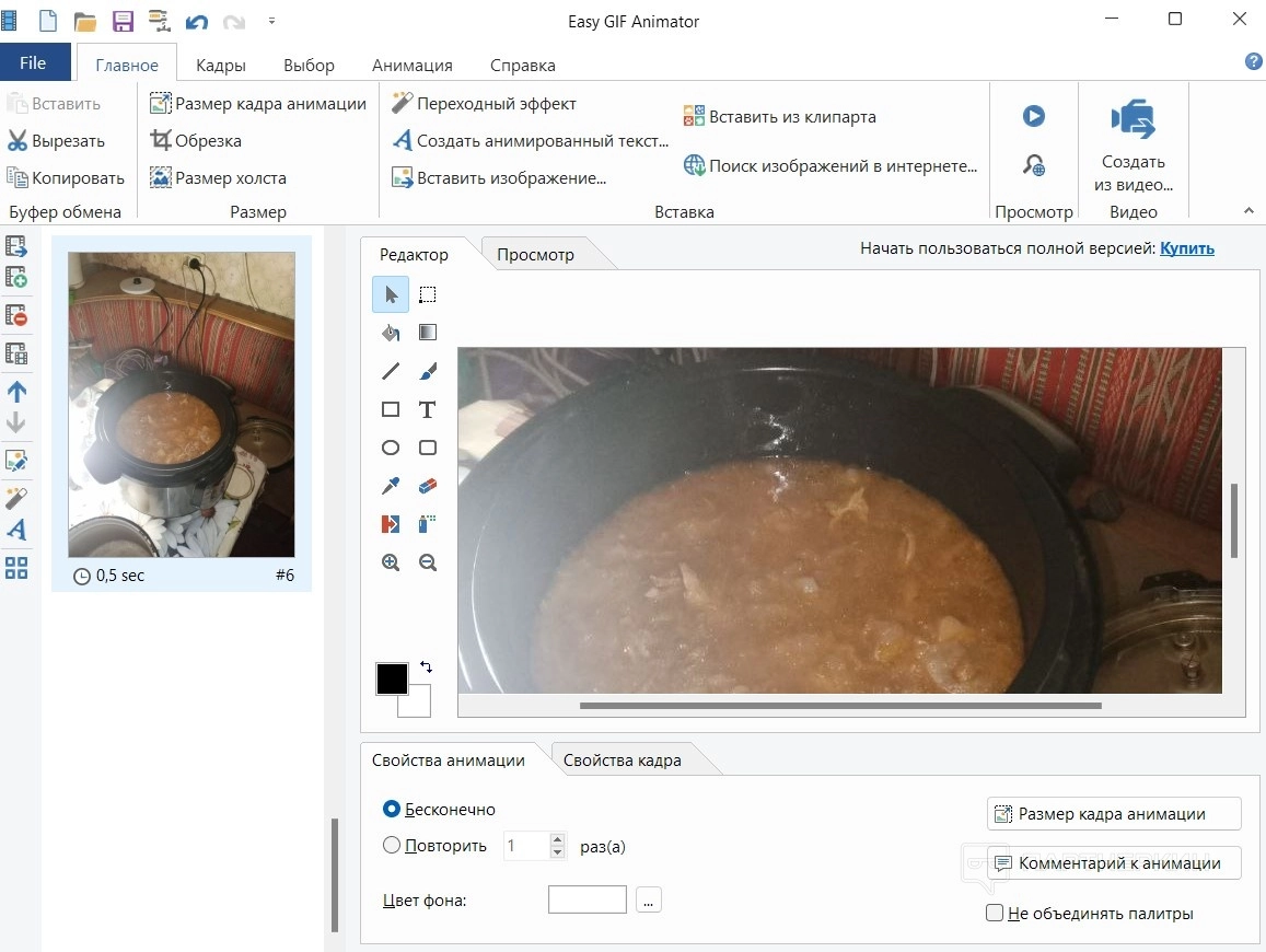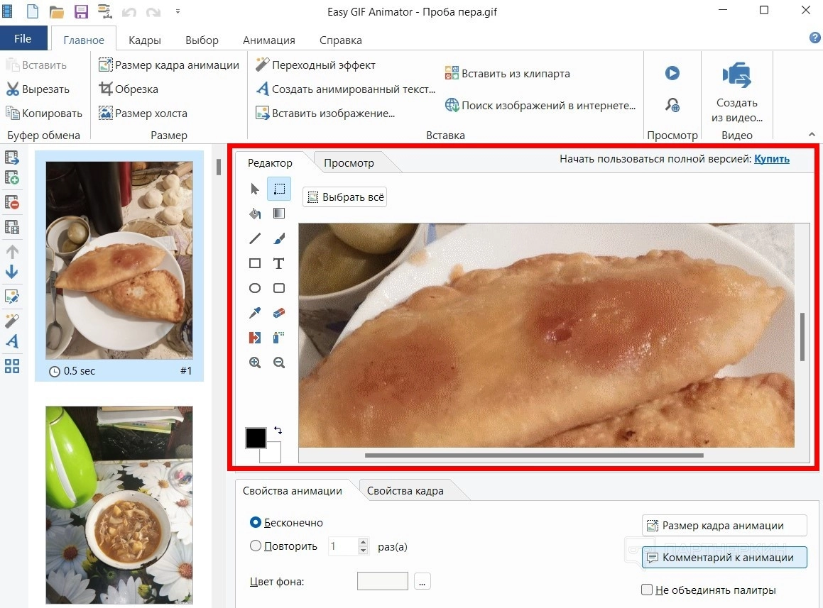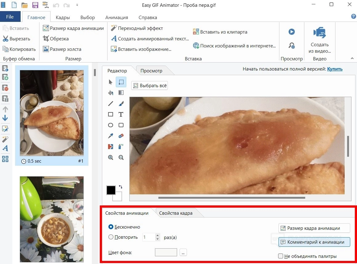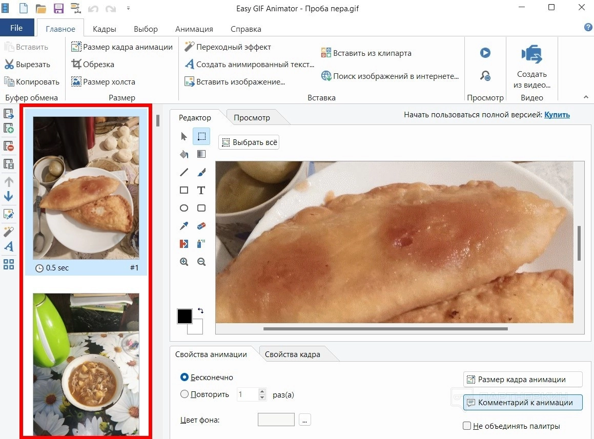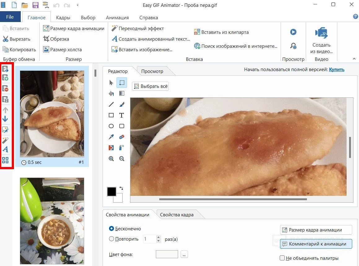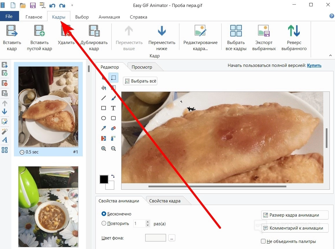 - Кадры. Позволяет настраивать загруженные картинки. Можно добавлять новые кадры, удалять, менять их местами, экспортировать и так далее.