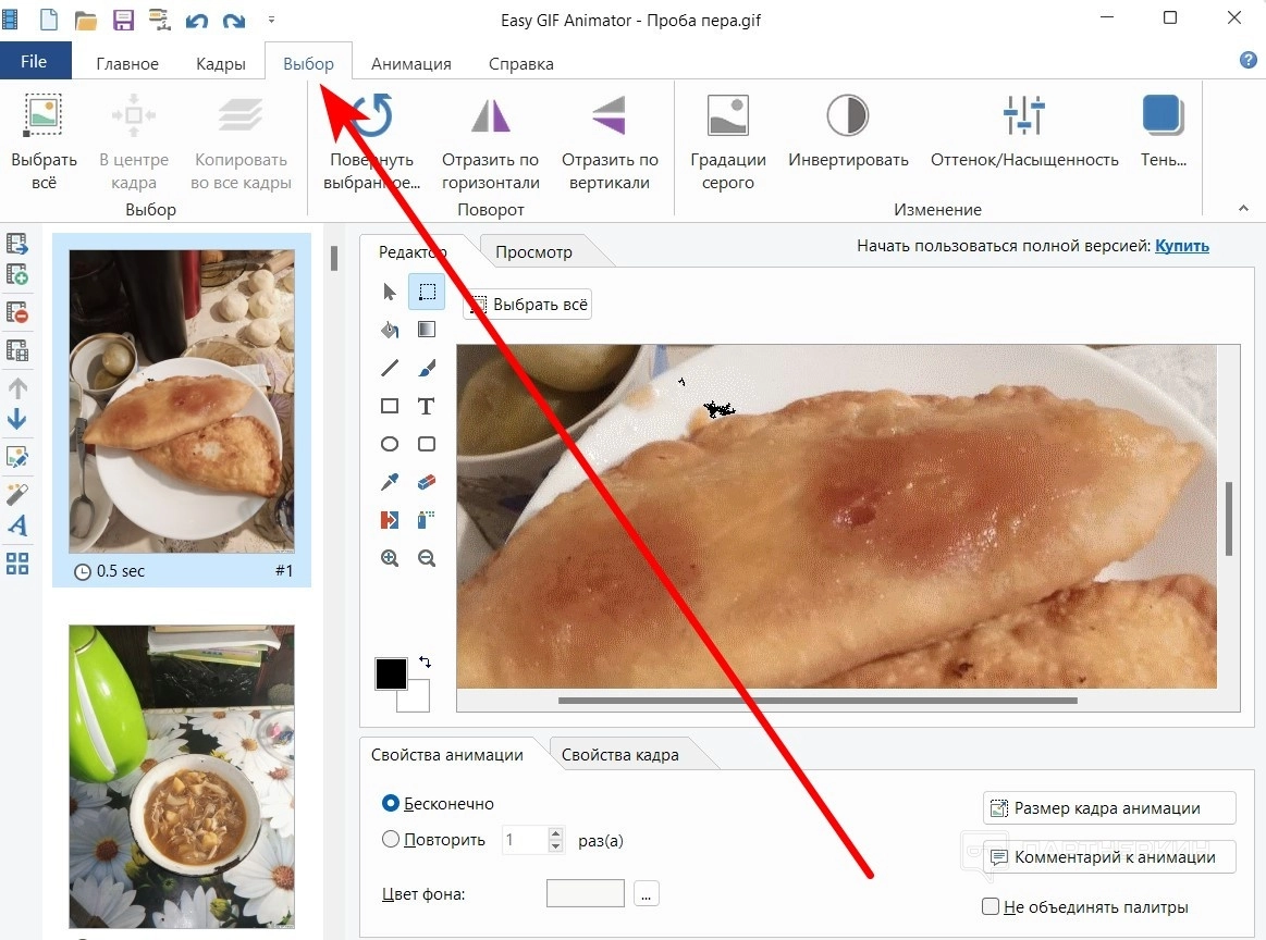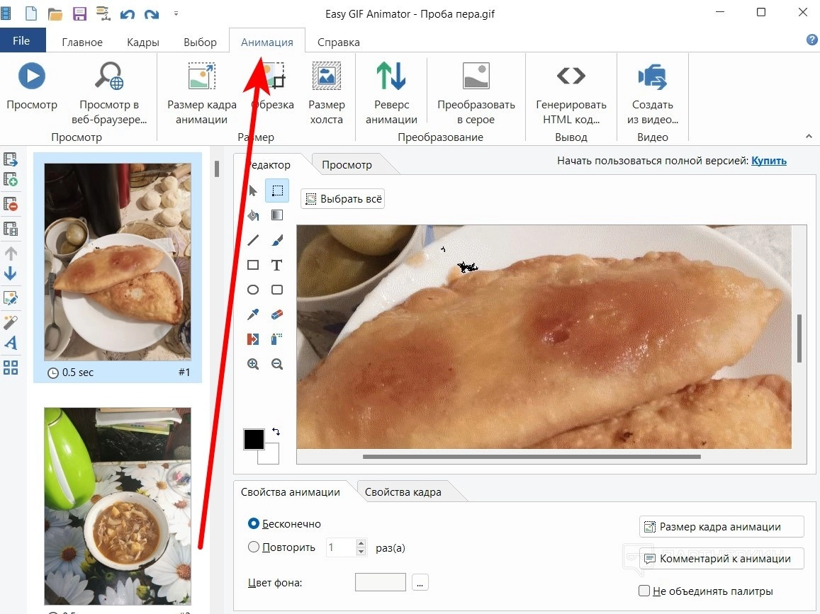 - Анимация. Сюда входят инструменты, которые управляют общими настройками кадров или всем проектом. Например, здесь можно генерировать HTML-код, обрезать кадры, менять размер холста, делать GIF черно-белым и так далее.
