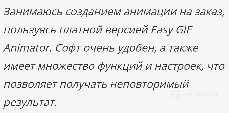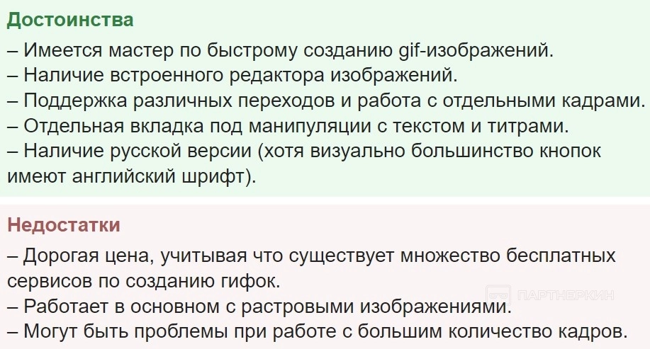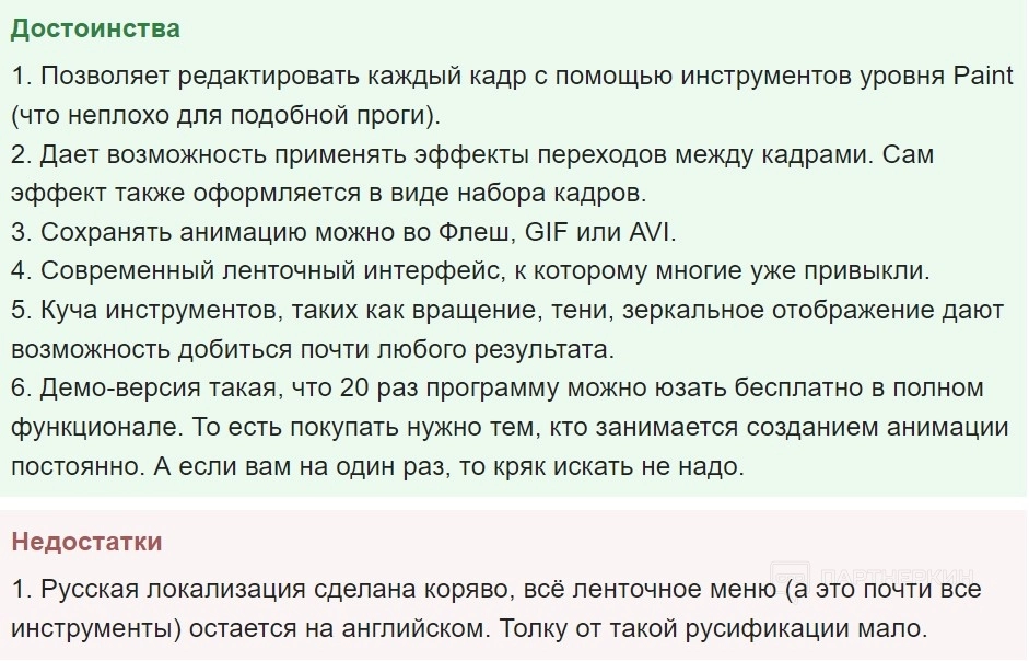 Другой пользователь высоко оценил функцию редактора, который упрощает создание анимационных роликов. Помимо этого, он отметил полезность функции мастера по быстрому созданию GIF-роликов. Это позволяет значительно сократить время, необходимое на создание анимационных фильмов. Данный пользователь также был доволен поддержкой разнообразных переходов, которые способствуют повышению уровня профессионализма создаваемых проектов. Вместе с тем, он указал на ряд недостатков программы: она имеет высокую стоимость и возможность работы только с растровыми изображениями, что ограничивает ее применение. Также он отметил, что при работе с большим количеством кадров могут возникать проблемы, которые могут затруднить создание более сложных анимационных программ.