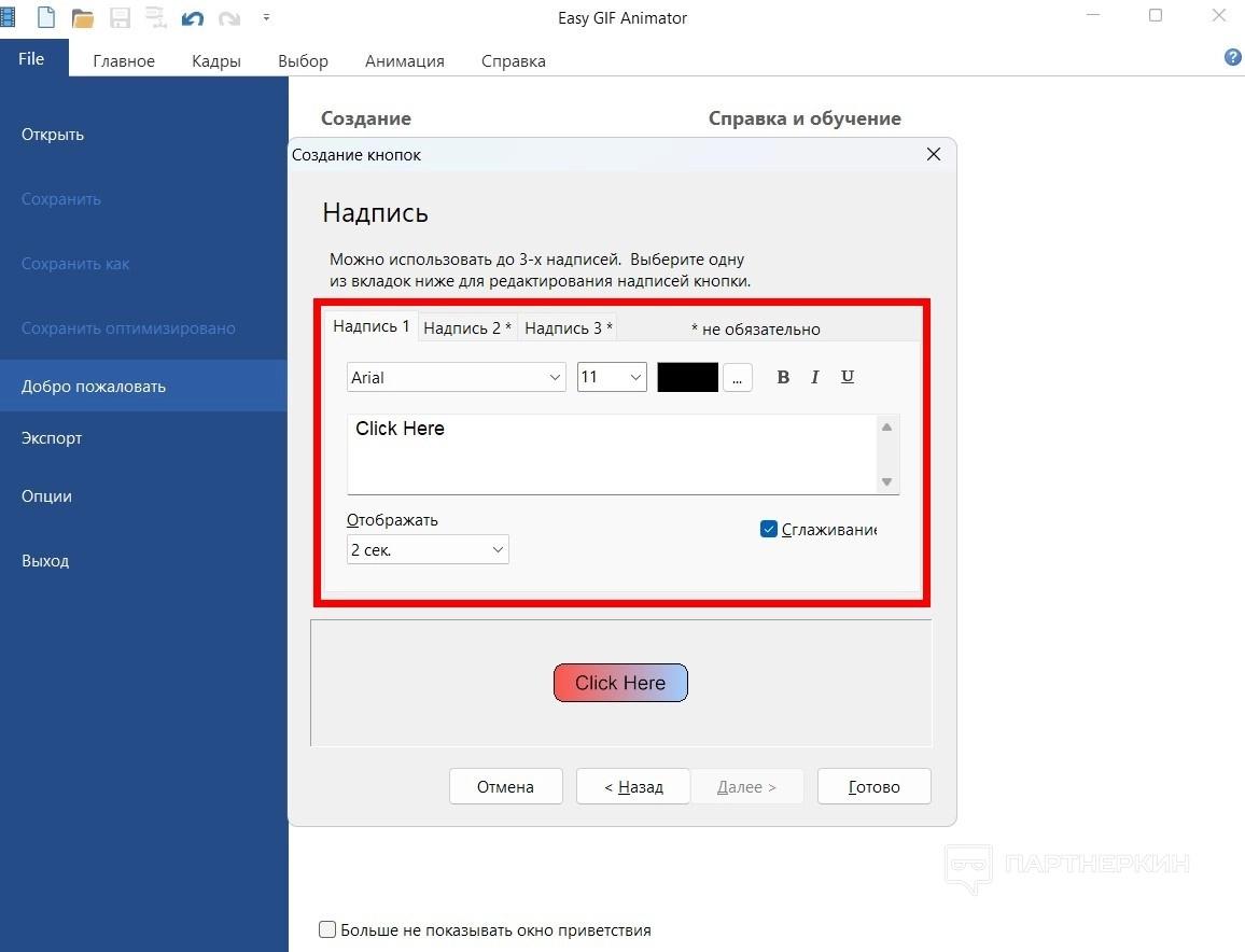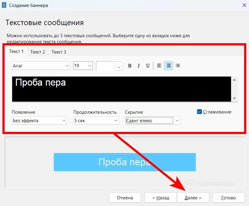 - Используйте сглаживание краев для лучшего эффекта. Можно этот пункт пропустить. Можно использовать до трех надписей. В обоих вариантах нажмите «Далее».