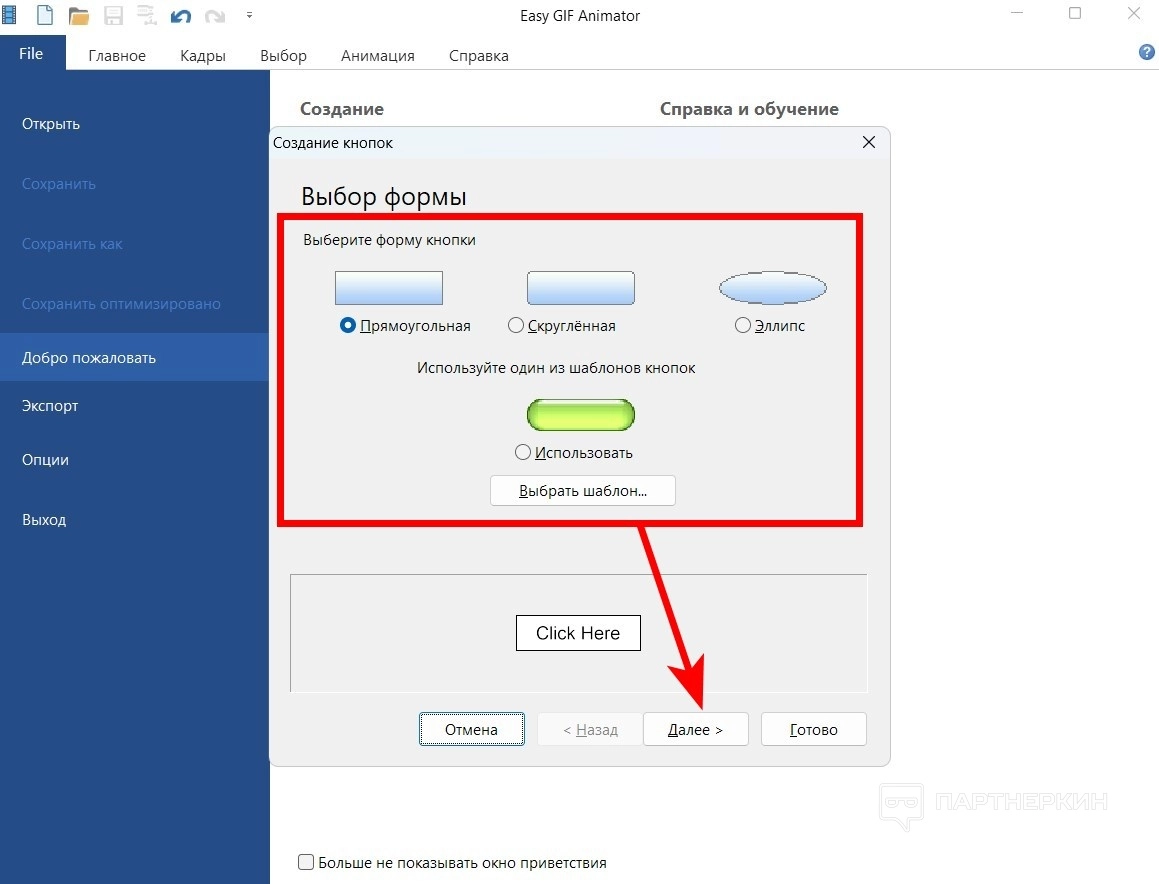 - Настройте форму кнопки и нажмите «Далее». Можно самостоятельно настроить форму, цвет и другие параметры или выбрать готовый шаблон.