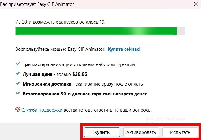 - После установки выберите вариант использования: купить, активировать, испытать. Последний вариант предоставляет доступ к 20 бесплатным запускам.