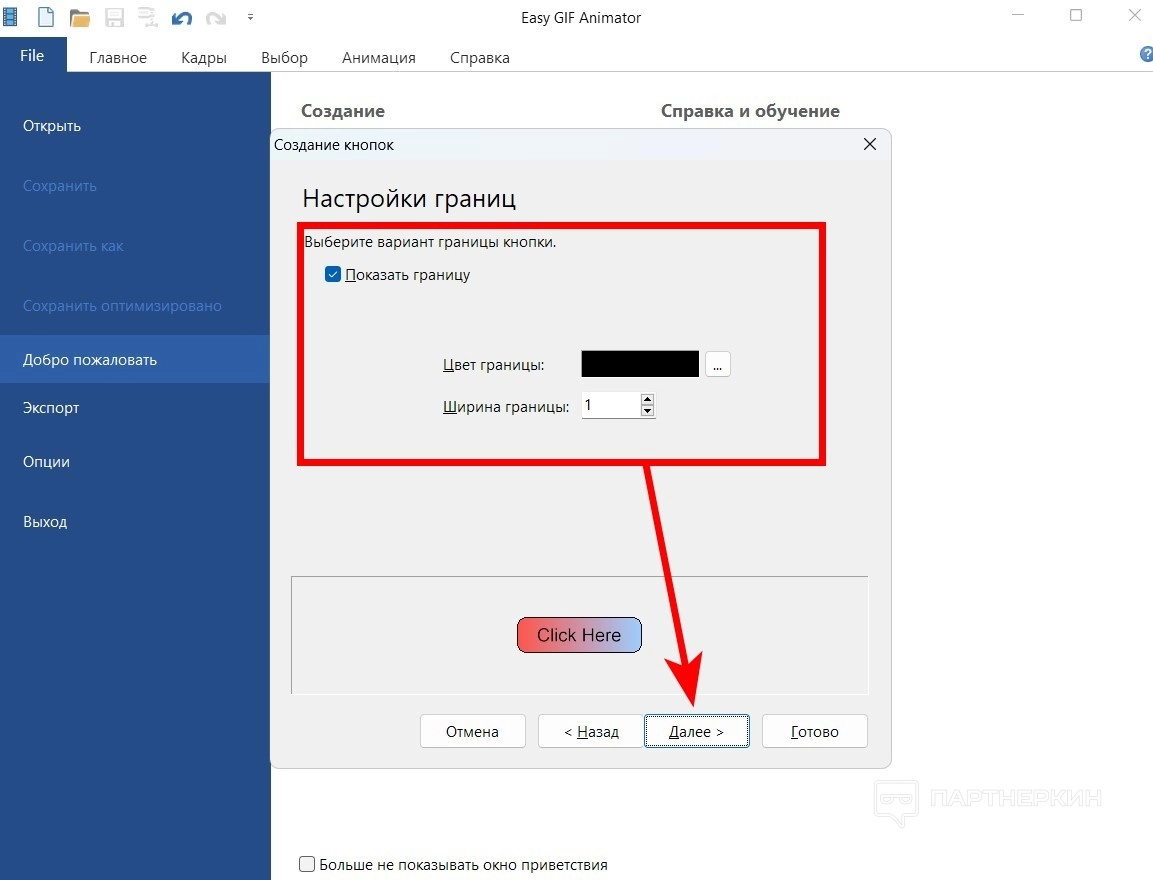 - Настройте размеры границ. Можно выбирать цвет. Нажмите «Далее».