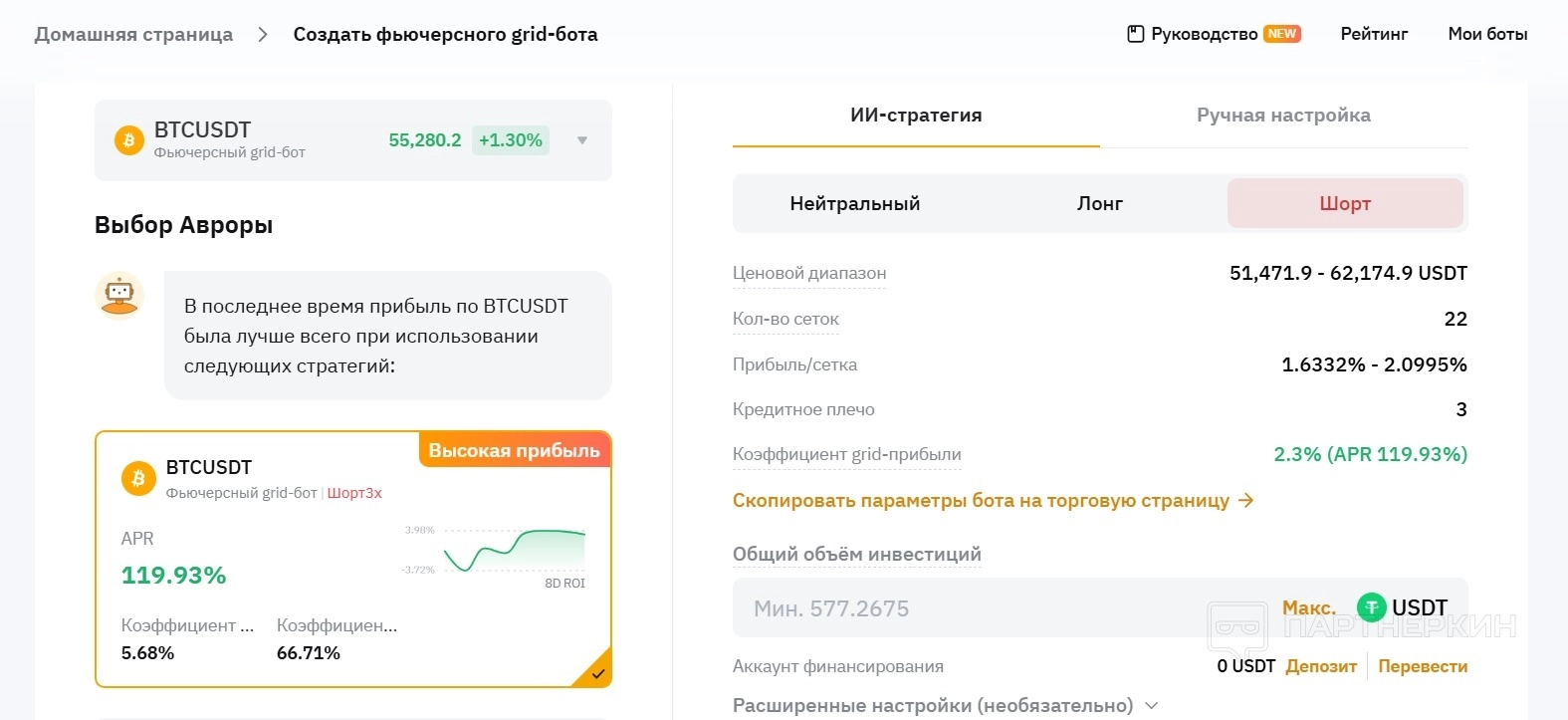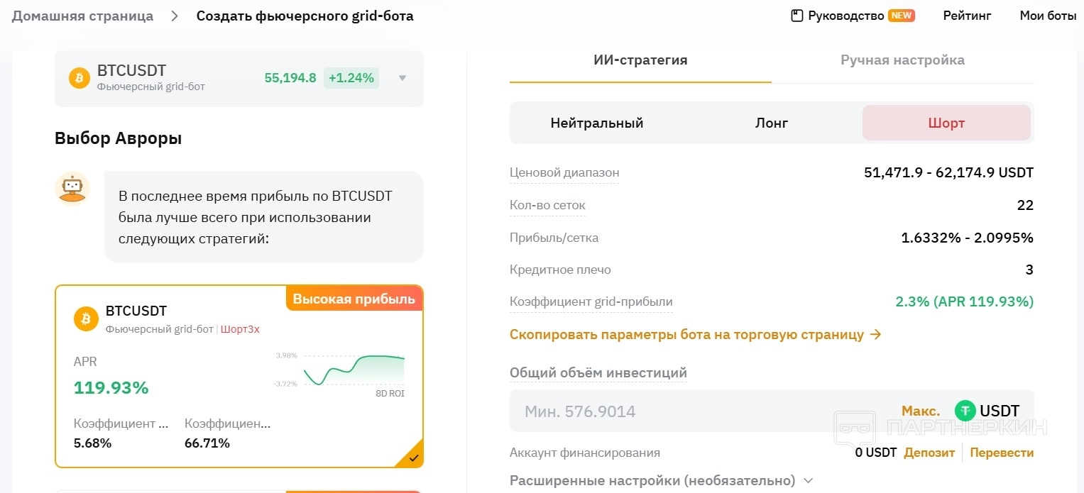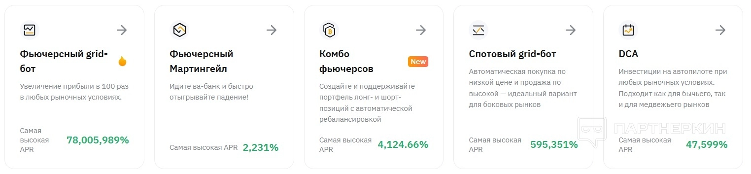 - Фьючерсный Grid-бот . Этот бот предназначен для автоматической торговли фьючерсами по принципу сетки. Он размещает ордера на покупку и продажу по заранее заданным уровням, что помогает извлекать прибыль из колебаний цен в любых рыночных условиях. Бот может значительно увеличить прибыль, используя стратегию сетки, которая позволяет зарабатывать даже при незначительных движениях рынка.