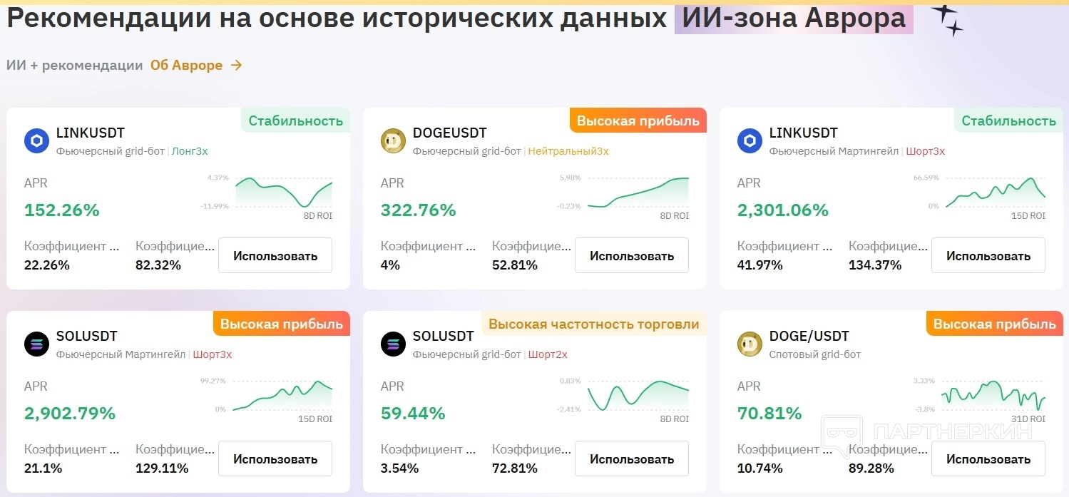 - Функциональные фильтры . Пользователи могут фильтровать ботов по различным критериям, таким как тип стратегии (фьючерсный grid-бот, фьючерсный Мартингейл, спотовый grid-бот), рынок (все), время работы (все) и ROI (возврат на инвестиции). Это позволяет быстро сузить выбор до тех ботов, которые соответствуют конкретным требованиям.