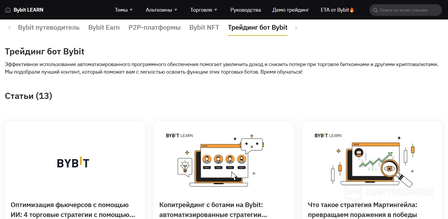 - Руководство . Здесь пользователи могут найти подробную информацию, как пользоваться торговыми ботами на платформе Bybit. Для углубленного изучения доступен раздел "Bybit Learn", где можно найти образовательные материалы, которые помогут освоить основы и продвинутые функции ботов.