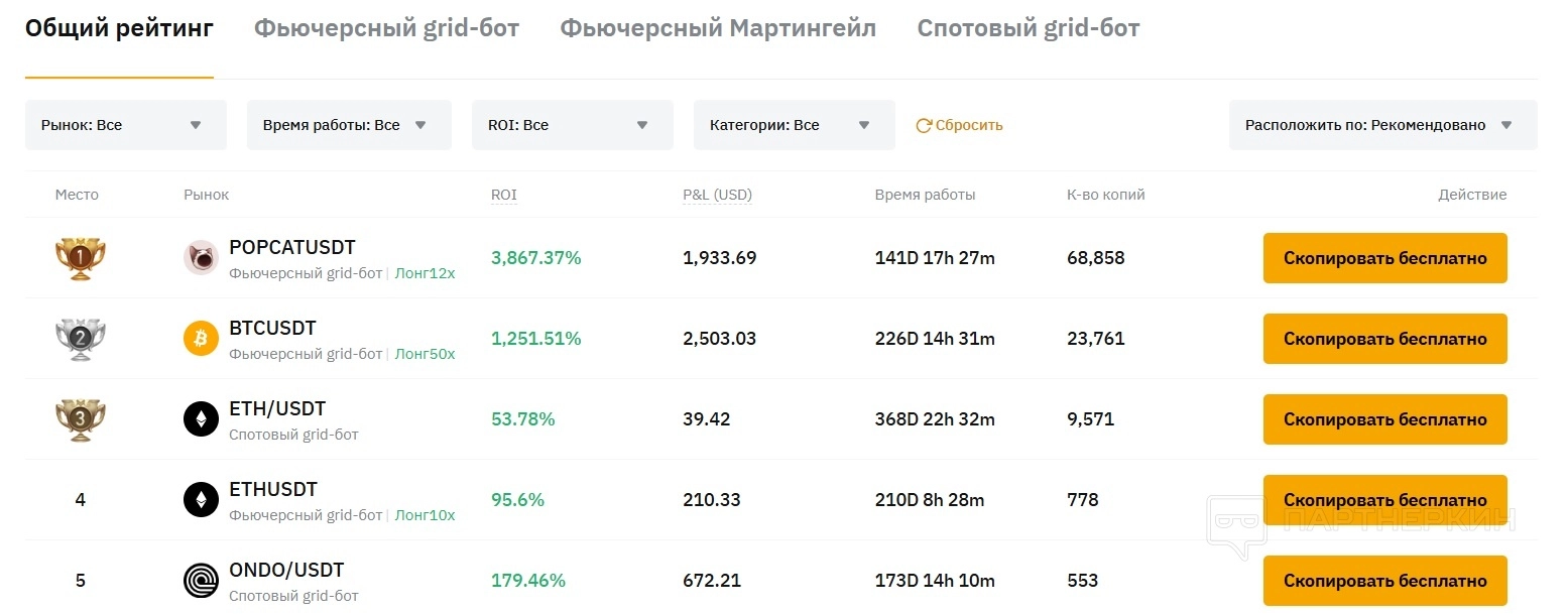 - Информация о ботах . Для каждого бота предоставляются ключевые показатели, такие как ROI, P&L (прибыль и убытки в долларах США), количество копий и время работы. Эти данные помогают трейдерам сделать осознанный выбор, основываясь на текущих результатах и популярности бота.