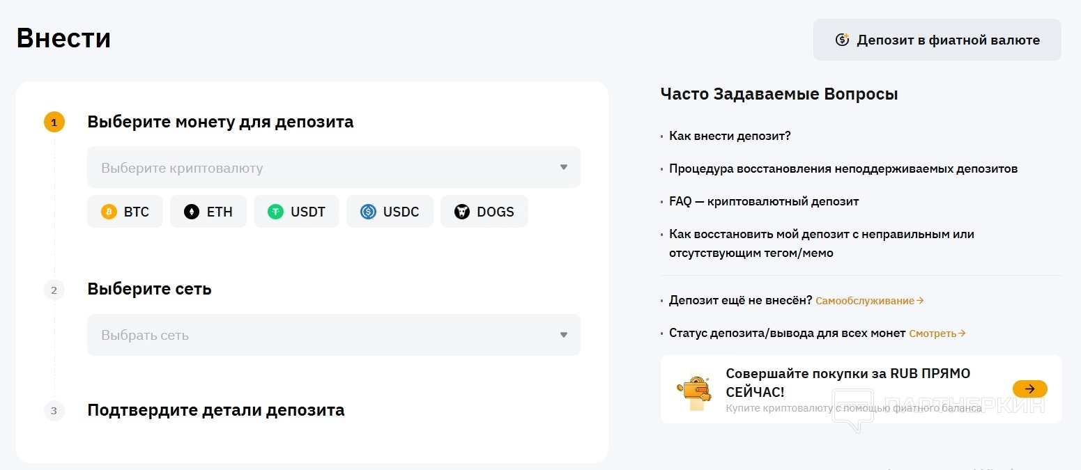 - Депозит в фиатной валюте — позволяет вносить фиат и использовать его для покупки криптовалют.