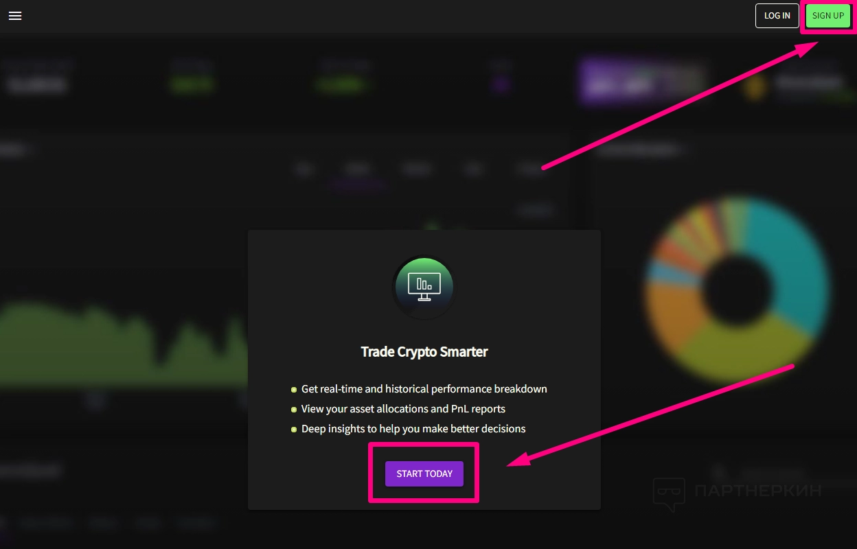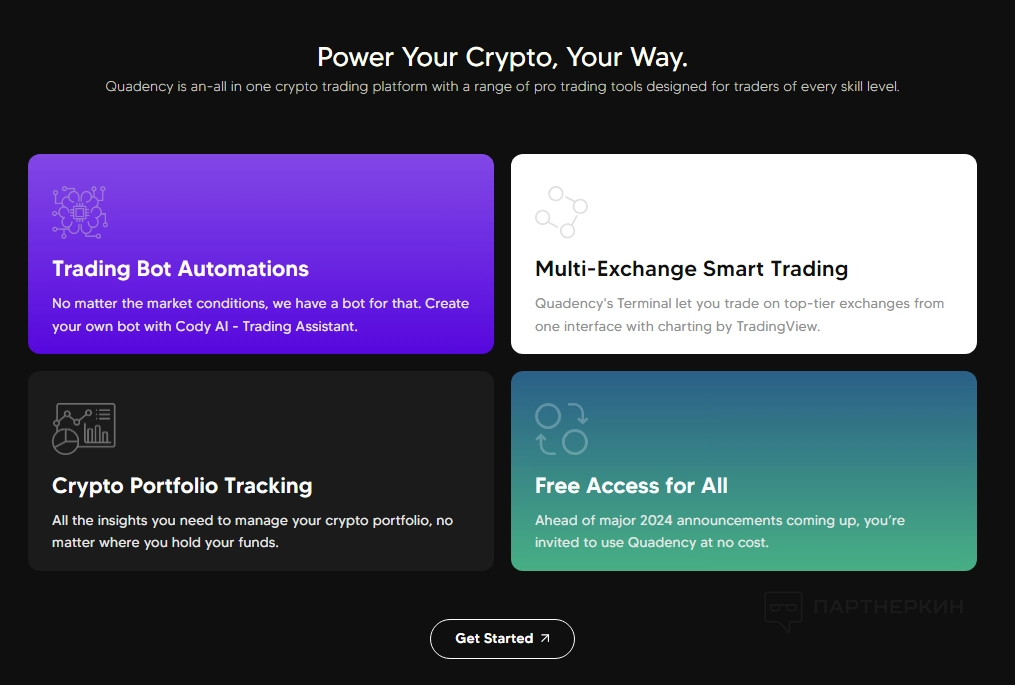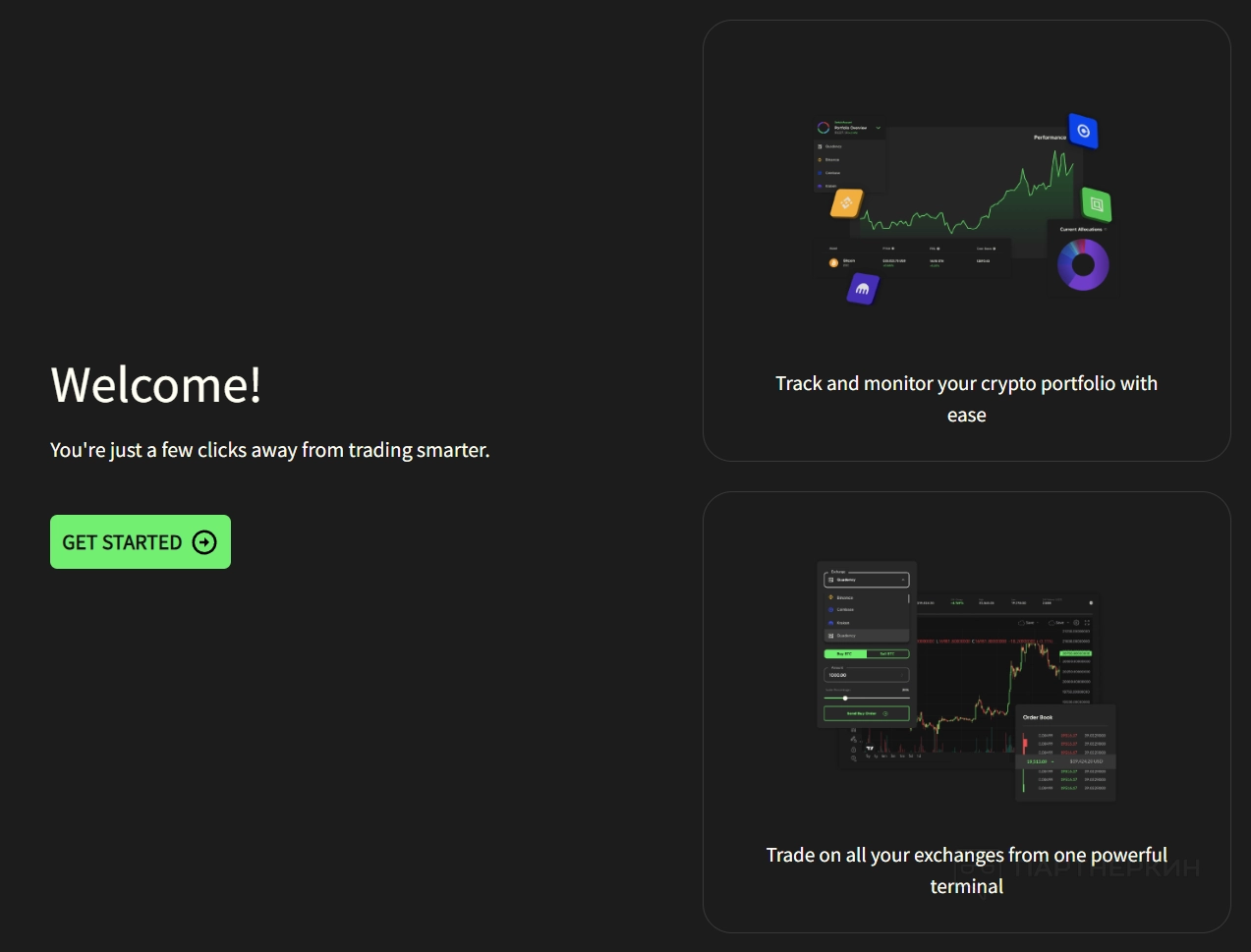 Кнопка «Get Started» ведет к первому шагу — настройке и подключению учетных записей на различных криптовалютных биржах: