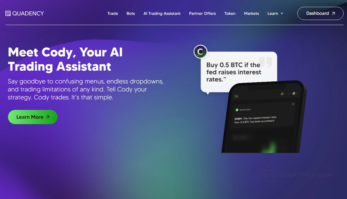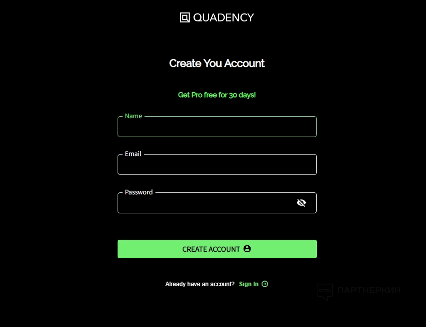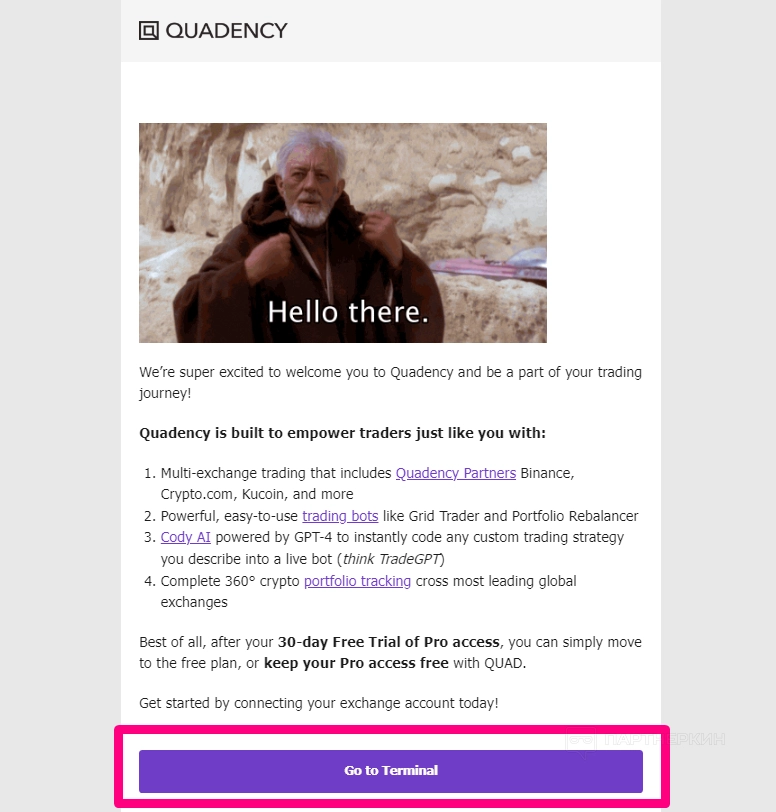 После успешной регистрации и активации учетной записи на Quadency пользователь переходит на приветственную страницу: