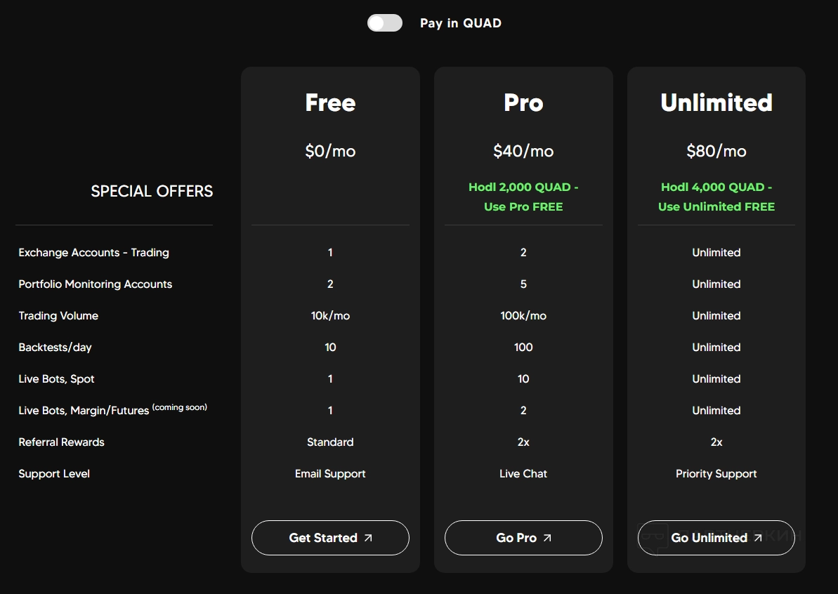 - Бесплатно . Бесплатный план обеспечивает доступ к базовым функциям, включая один торговый аккаунт, два аккаунта для портфеля и один бота. Торговый объем ограничен 10 тысячами долларов в месяц.