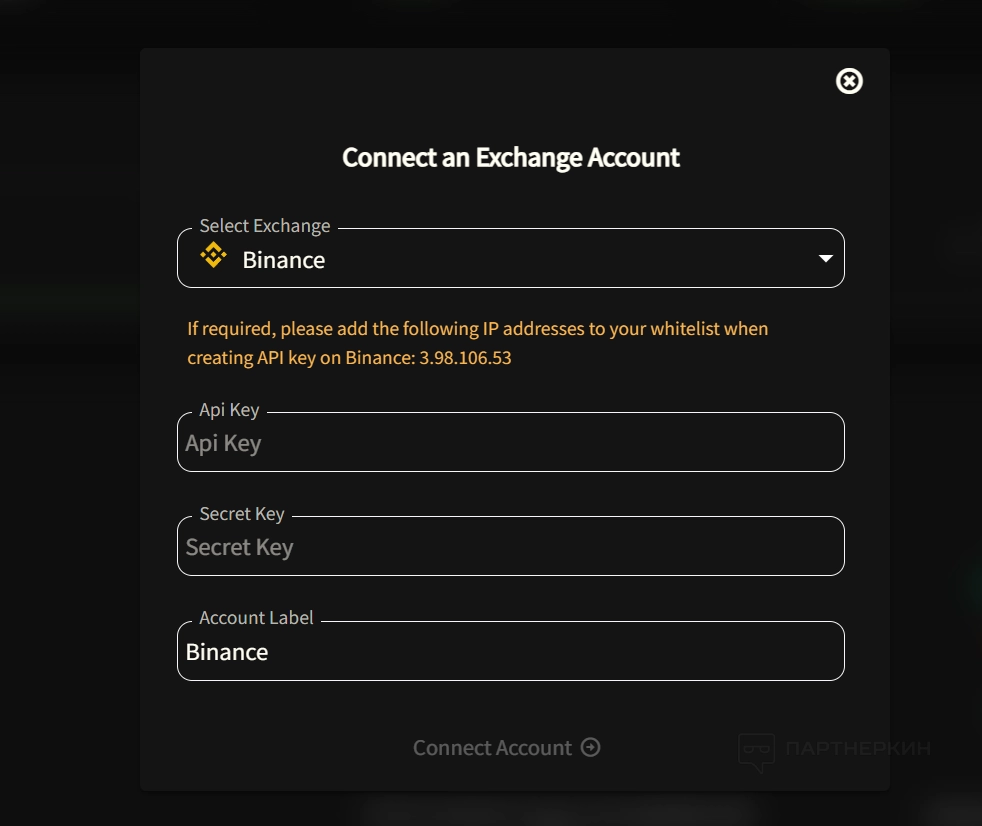 После выбора необходимо подключить аккаунт на бирже, указав API-ключи, чтобы начать автоматическую торговлю: