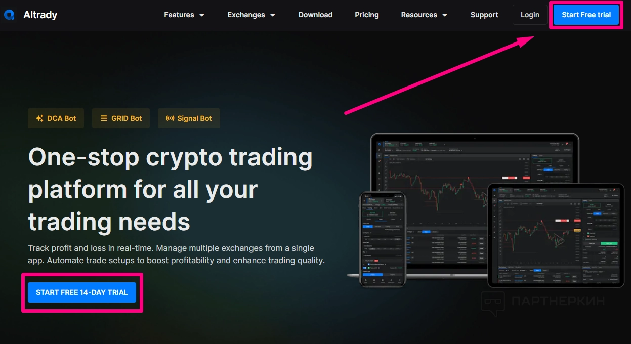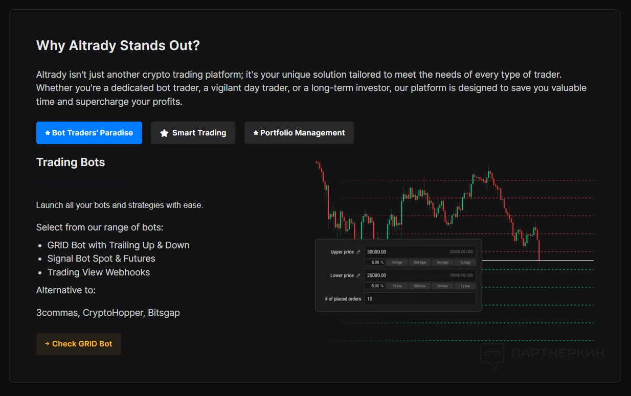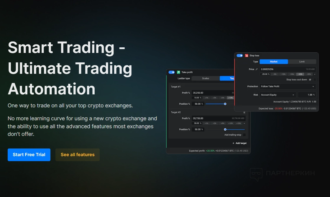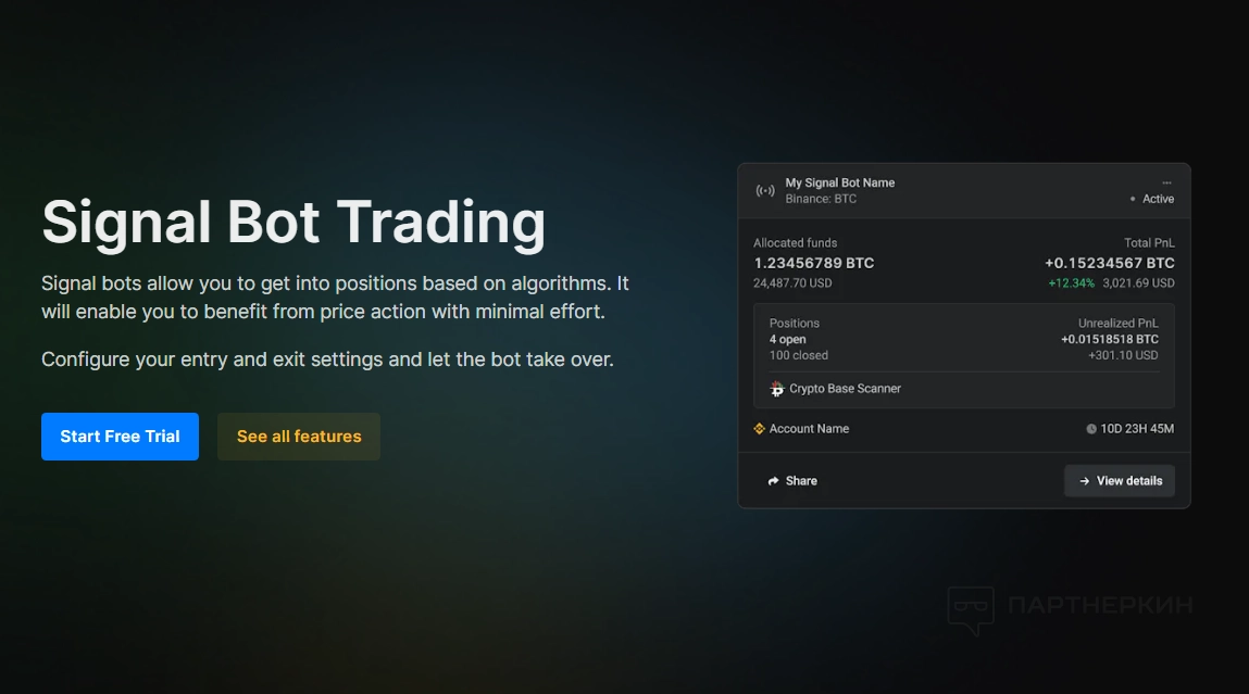 Среди основных преимуществ платформы стоит особо отметить бумажный трейдинг, позволяющий сразу же тестировать любые стратегии без денежных вложений, а также большое количество доступных бирж. Автоматические боты, вроде DCA и Grid, будут особенно полезны для тех, для тех, кто хочет настроить торговлю и не следить за рынком вручную.