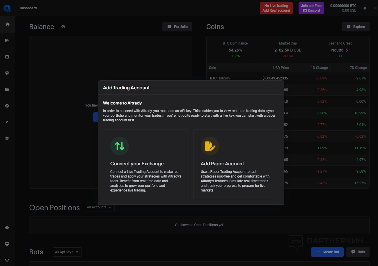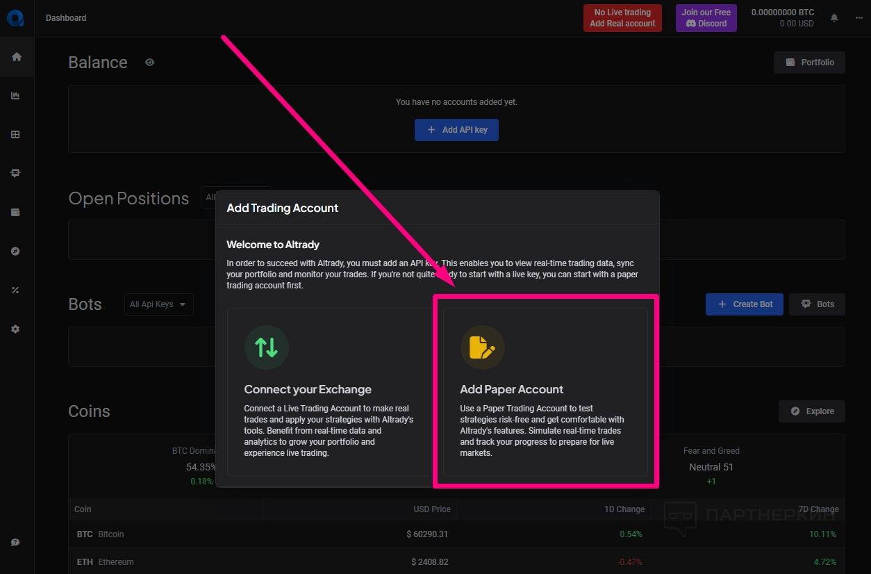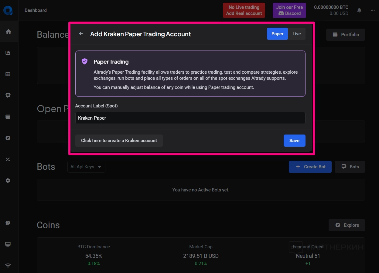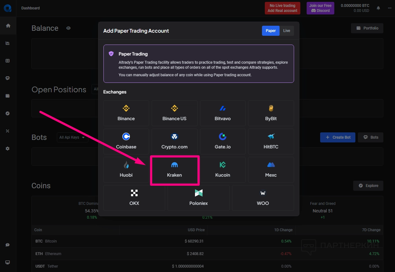 Сразу после регистрации можно добавить бумажный аккаунт, выбрав опцию Add Paper Account. Такой аккаунт позволяет тестировать различные стратегии и инструменты платформы, запускать ботов и размещать ордера на поддерживаемых биржах. Биржи для торговли выбираются из списка, в который входят такие популярные платформы, как Binance, Kraken и другие.