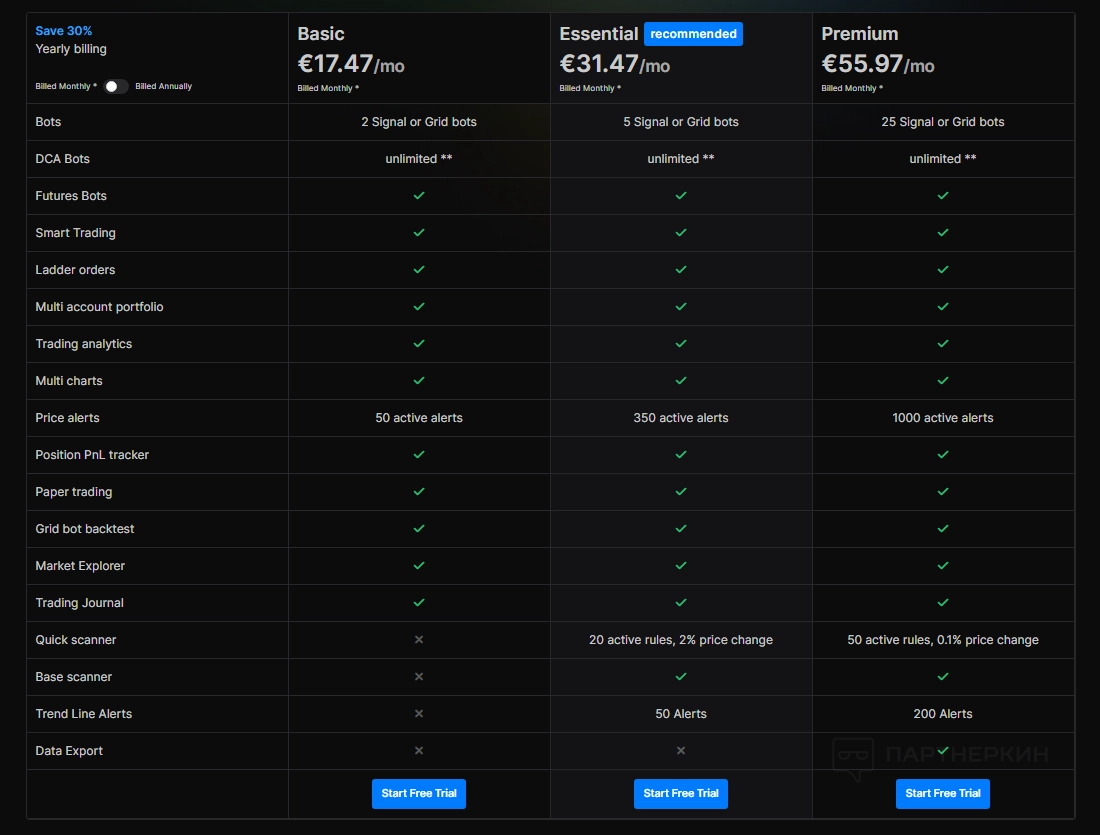 - Basic — стоимость €17,47 в месяц. План включает доступ к двум ботам (Signal или Grid), неограниченному количеству DCA-ботов, умной торговле, аналитике, мульти-диаграммам и ряду других функций. Однако этот план ограничен 50 активными оповещениями и не включает такие инструменты, как базовый сканер и экспорт данных.