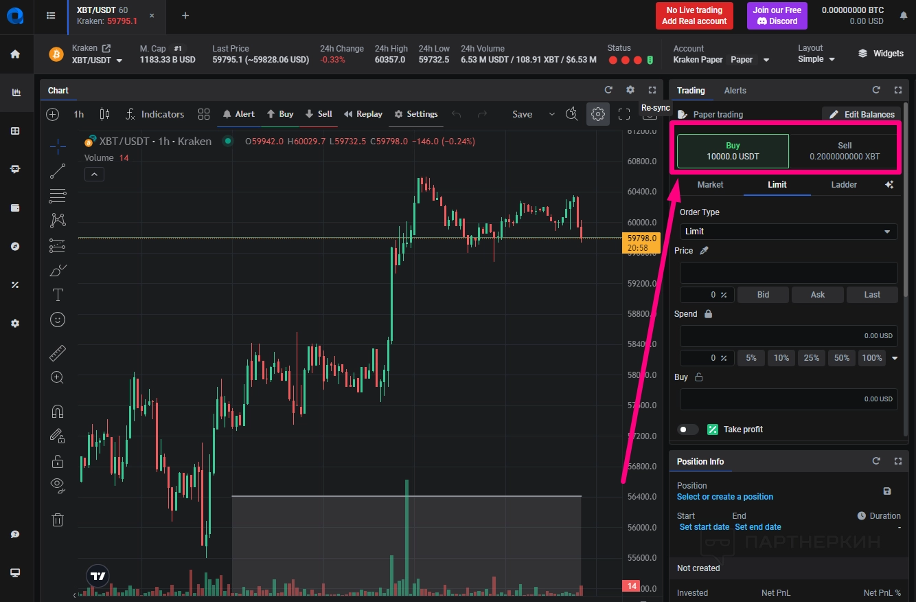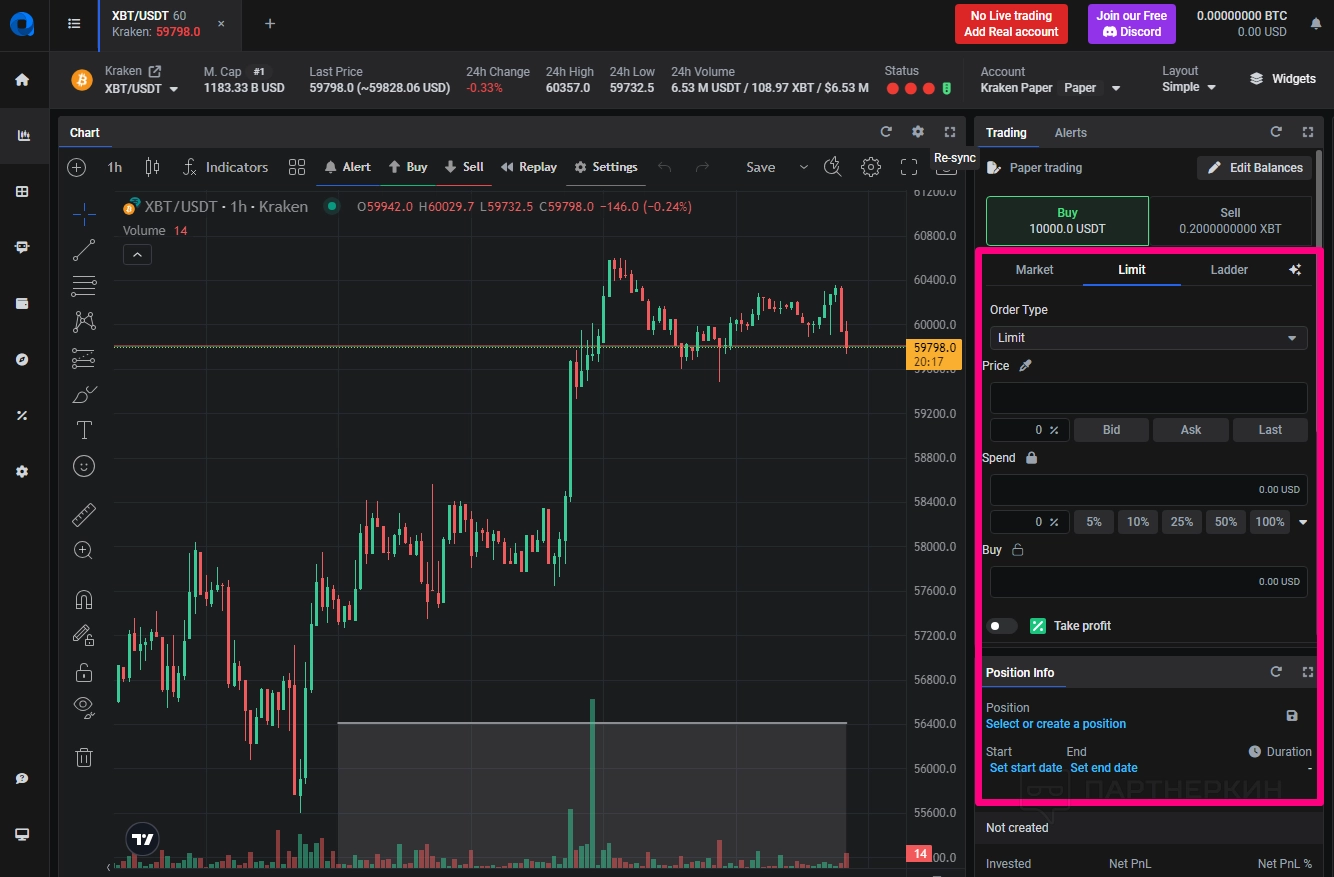 Бумажный трейдинг предоставляет возможность размещать ордера в условиях, максимально приближенных к реальной торговле. Поэтому в этом режиме пользователям доступно создание лимитных ордеров с настройками цены, объема и дополнительных параметров, таких как Take profit, для автоматизации управления сделками.