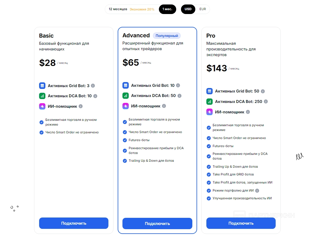 - Pro ($143/месяц) — для профессионалов. Включает 50 GRID-ботов, 250 DCA-ботов, улучшенный ИИ, Take Profit для ботов и полные функции реинвестирования.