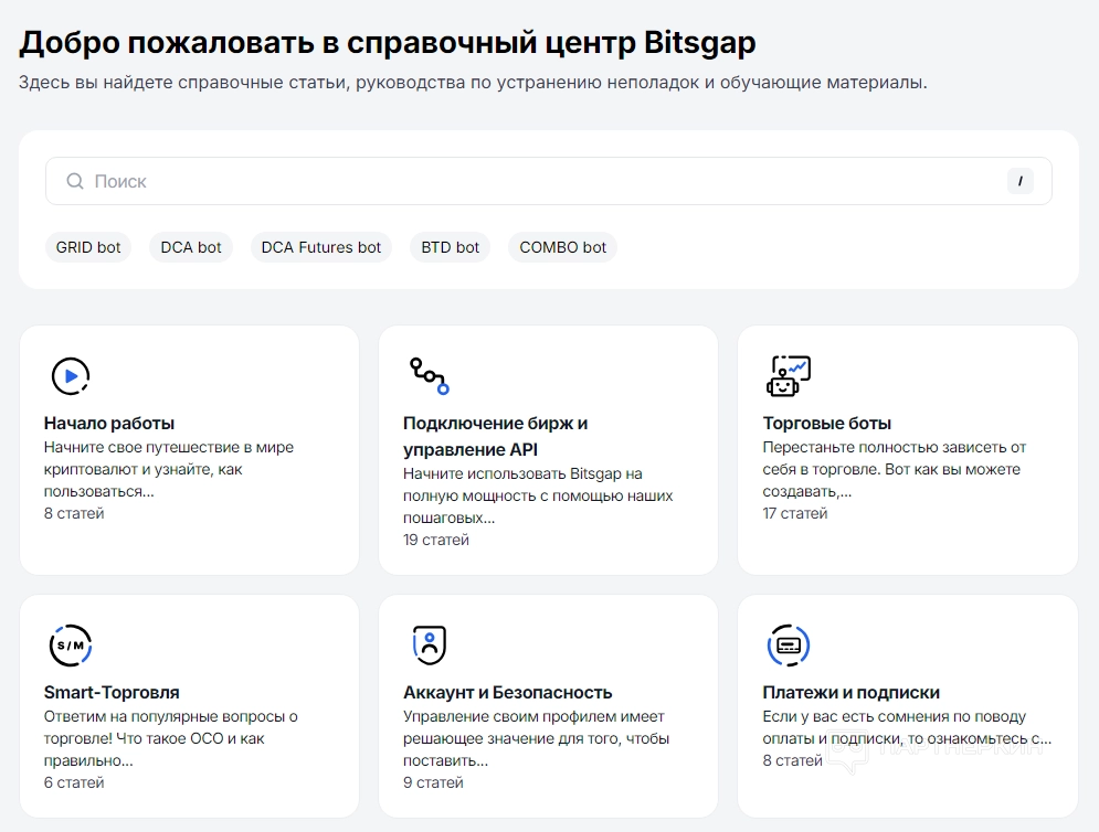 Получить дополнительную информацию об использовании платформы пользователи могут в справочном центре Bitsgap. Разделы включают инструкции по началу работы, подключению бирж через API, настройке торговых ботов, smart-торговле, управлению аккаунтом и безопасности, а также платежам и подпискам.