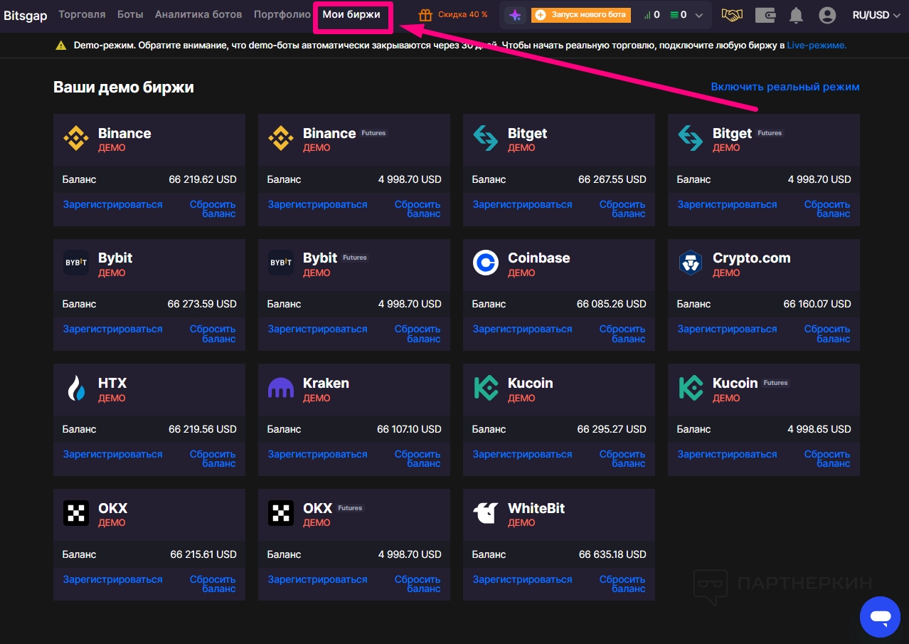Это отличная возможность для новичков понять, как работает платформа и проверить эффективность своих стратегий перед переходом на реальную торговлю. Демо-режим доступен всем новым пользователям сразу после регистрации. Чтобы увидеть перечень бирж, работающих в этом режиме, и количество виртуальных денег на каждой из них, необходимо выбрать вкладку «Мои биржи» в рабочем пространстве: