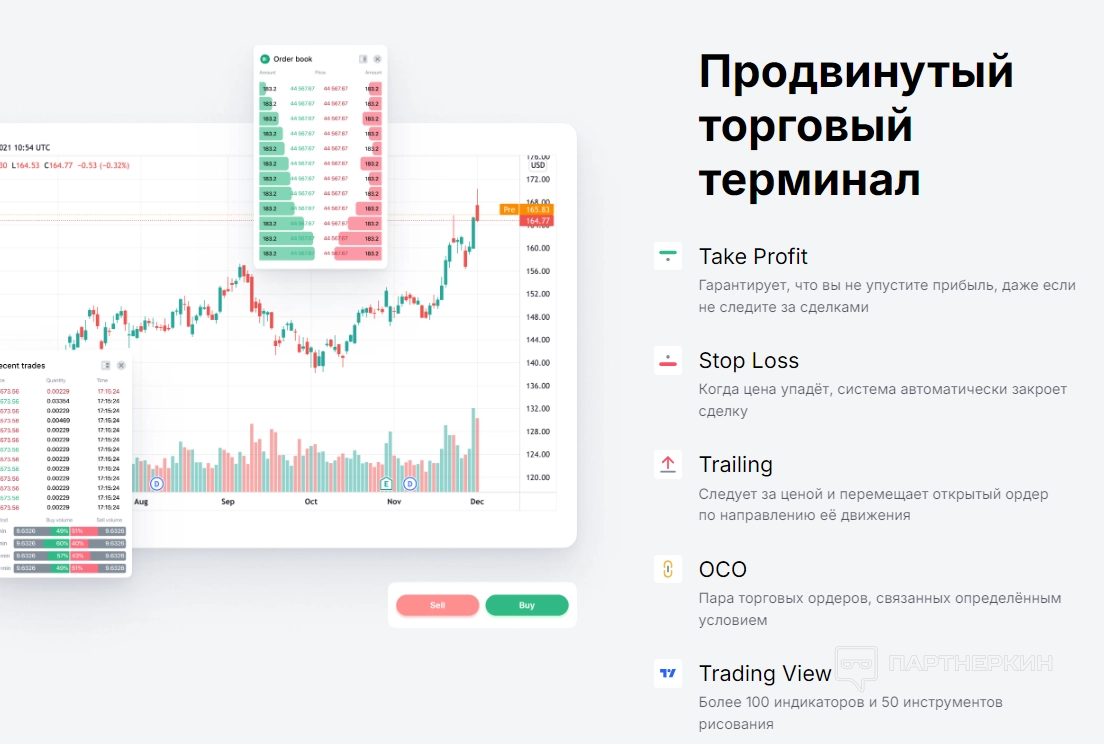 На платформе пользователи найдут удобный торговый терминал, который позволит им эффективно управлять своими сделками с помощью нескольких важных инструментов. Терминал содержит несколько ключевых функций: