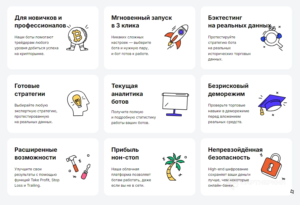 - Удобство настройки . Каждый бот легко настраивается под индивидуальные цели и стратегии. Гибкость параметров позволяет адаптироваться под любые рыночные условия, будь то медвежий рынок или высокая волатильность.