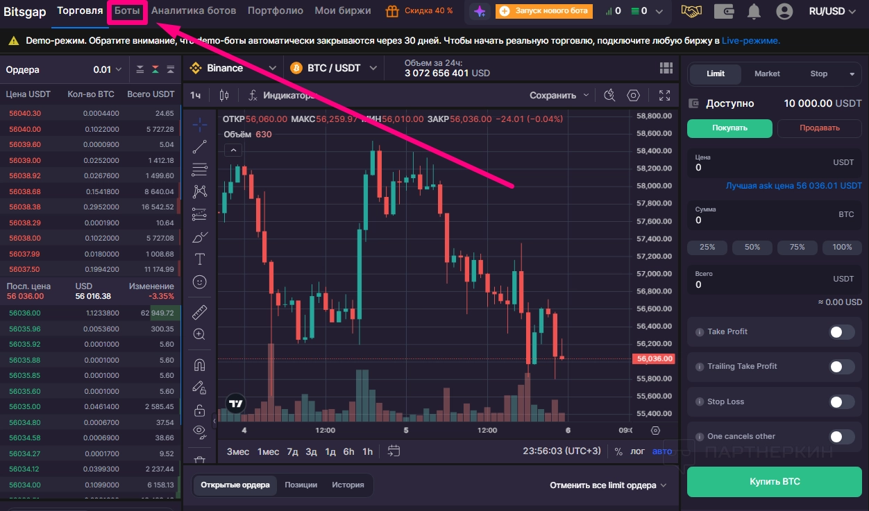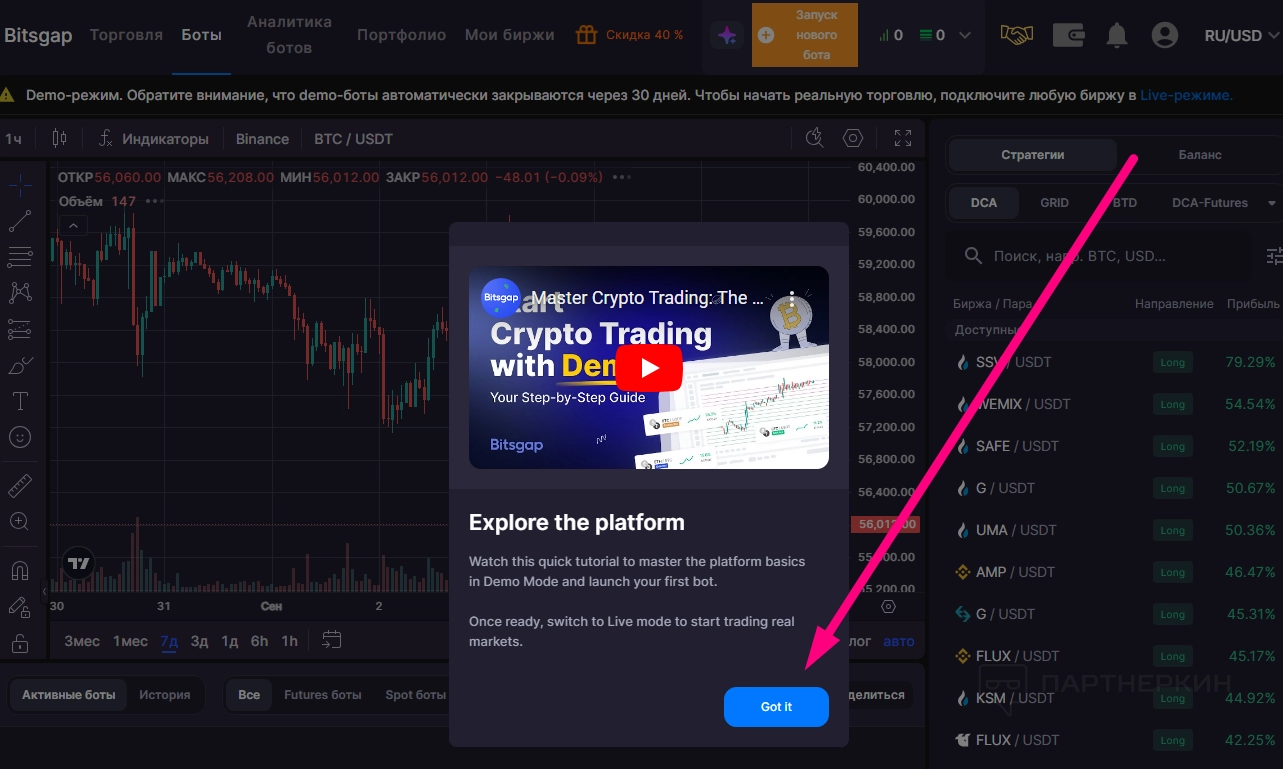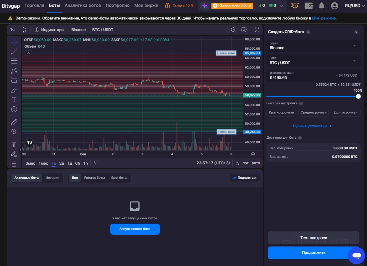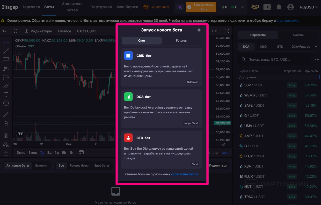 Демо-режим с 10 демобиткоинами для тестирования стратегий |