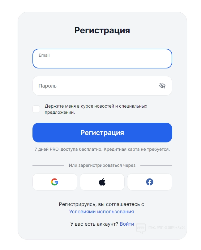 Нажав на любую, пользователь сразу переходит к созданию аккаунта. Для удобства также можно авторизоваться через почту или соцсети, что ускорит процесс: