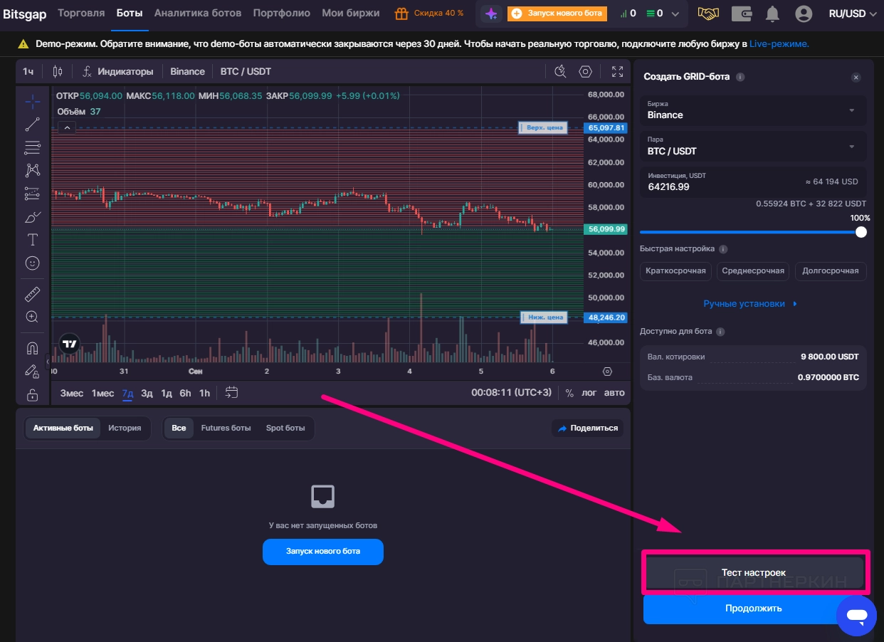 Платформа предлагает два варианта действий: протестировать настройки перед запуском или сразу продолжить для активации бота. Функция «Тест настроек» позволяет предварительно оценить, как бот будет работать на основе введенных данных, прежде чем приступить к реальной торговле: