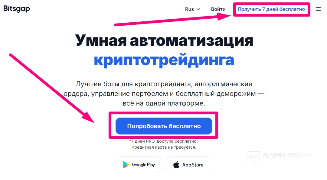 Новичкам доступен 7-дневный пробный период. Но для начала работы с сервисом придется создать аккаунт. Для этого на главной странице необходимо нажать на одну из кнопок «Попробовать бесплатно»: