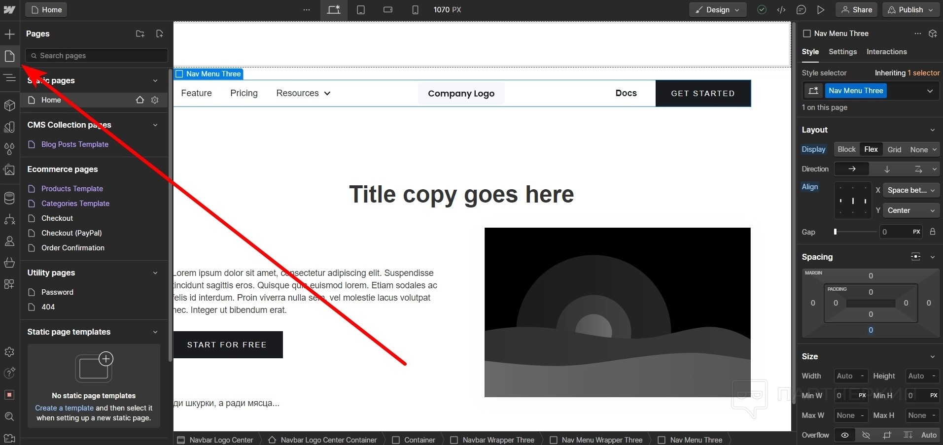 - При выделении любого элемента слева будет появляться навигатор с древом веб-сайта.