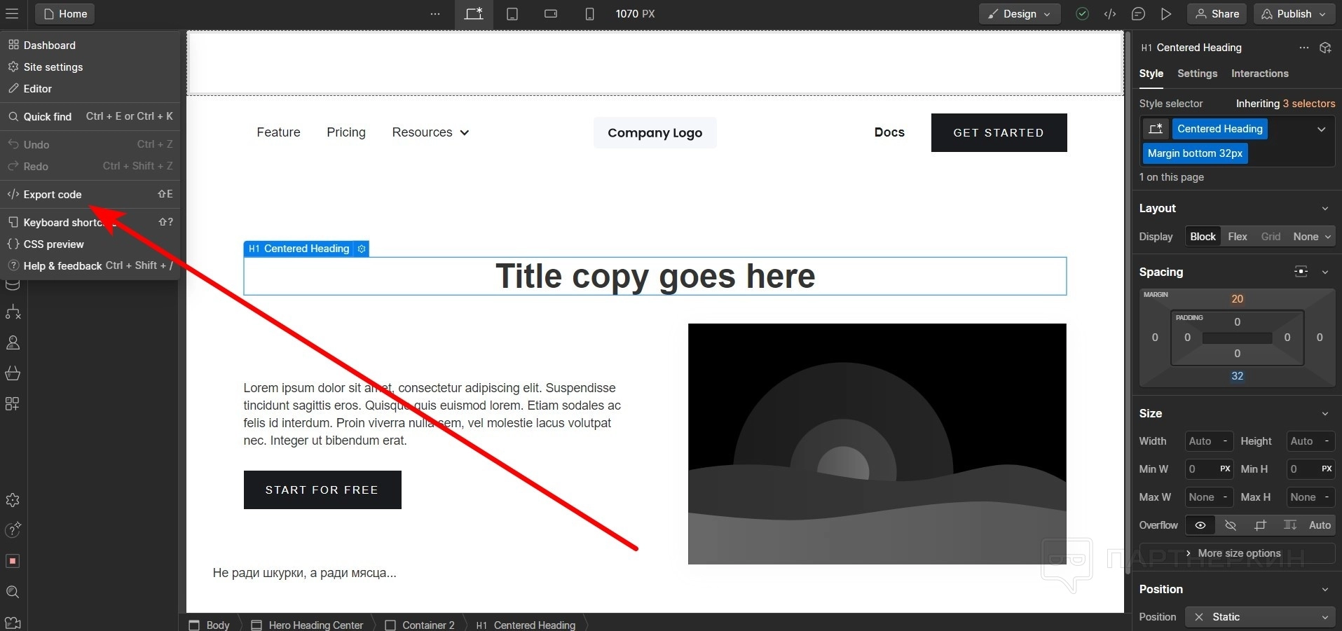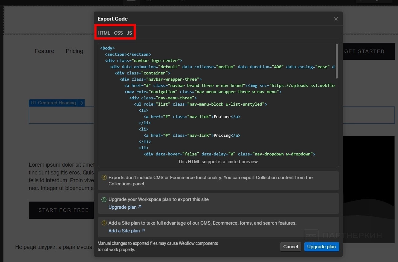 - Если есть достаточно знаний для работы с кодом, используйте панель Export code .