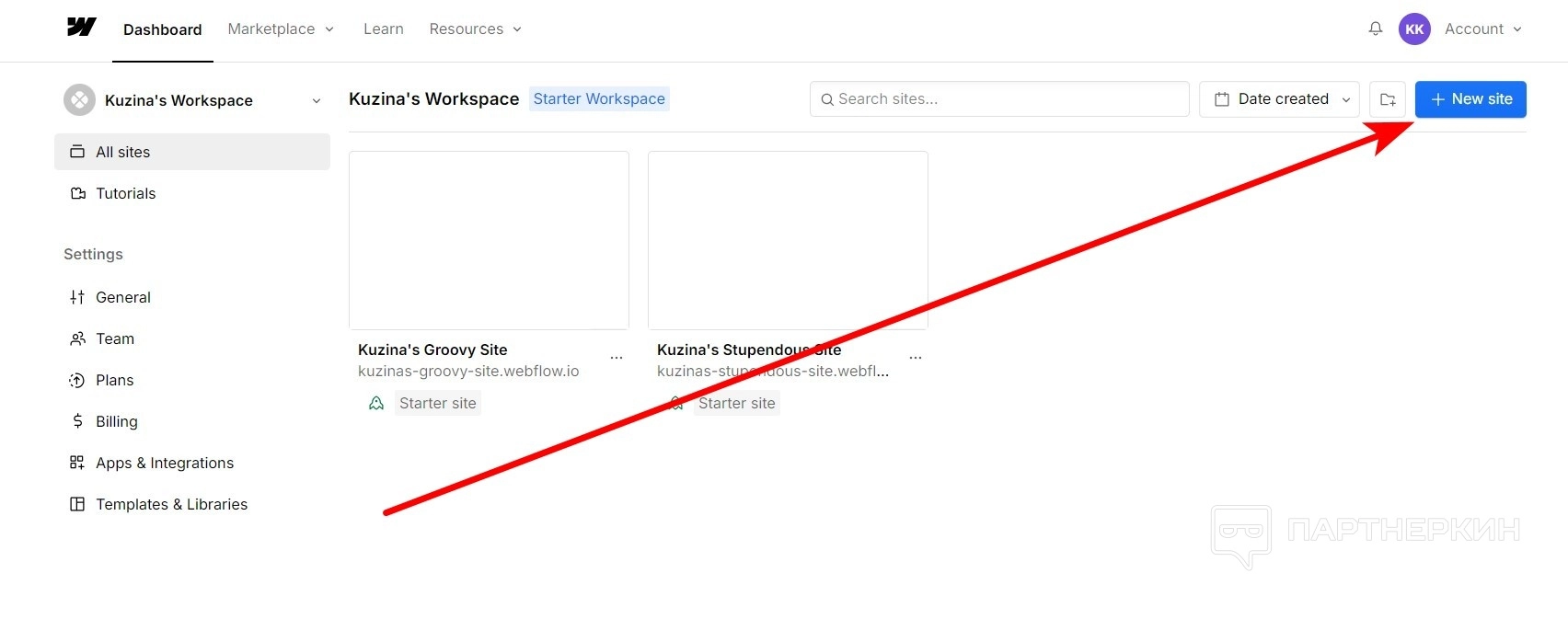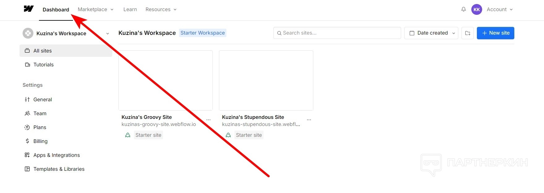 - В Дашборде выберите пункт New site .