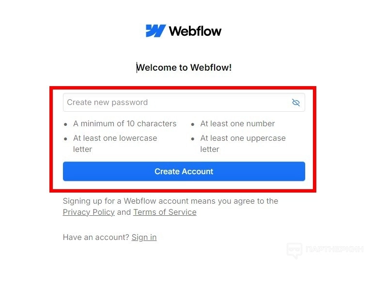 - Придумайте пароль: минимум 10 символов с латинскими буквами и хотя бы одним символом. Нажмите на кнопку Create account .