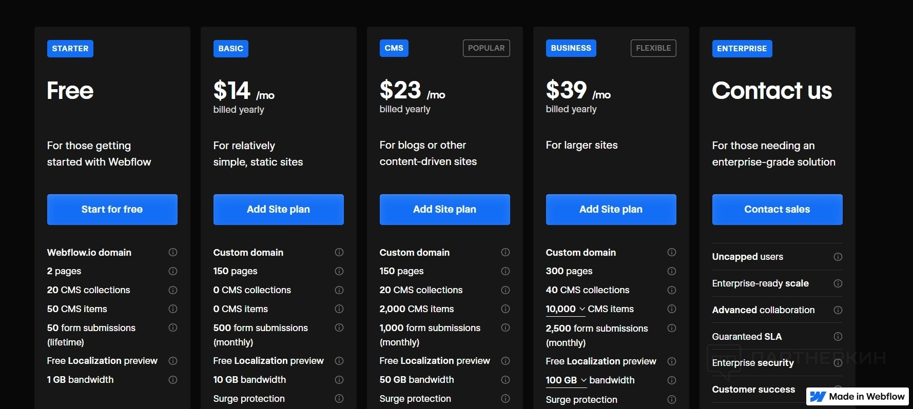 Включает базовый функционал, такой как домен Webflow.io, возможность создания двух страниц, 20 коллекций CMS и 50 элементов CMS. Пользователи также получают 1 Гб дискового пространства и возможность бесплатной локализации. Данный тариф позволяет отправить до 50 форм в течение всего срока действия плана.