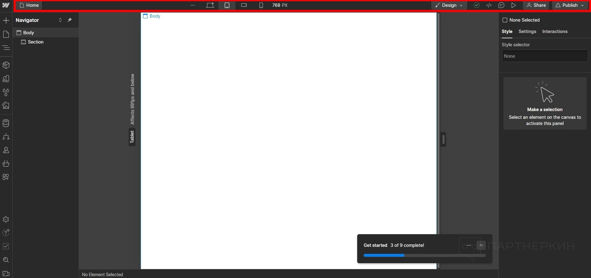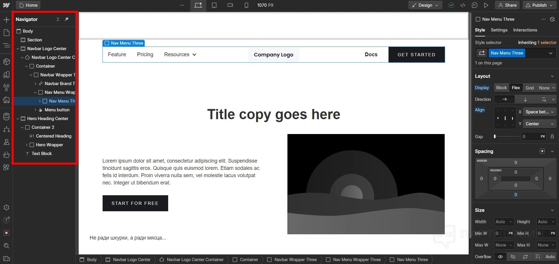 - Выделенный объект будет показывать, в какой иерархии он находится. Также, выделяя объект в навигаторе он будет отображаться на странице.