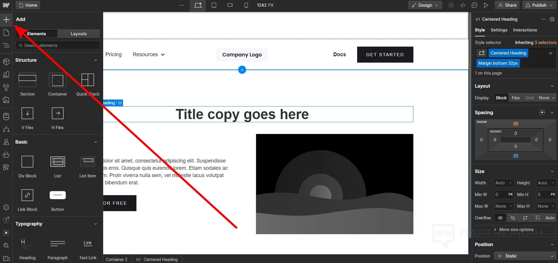 - Чтобы добавить новый блок, наведите на верхнее значение элемента сайта. Появится иконка «+». Нажмите ее и выберите, какой контейнер хотите добавить.