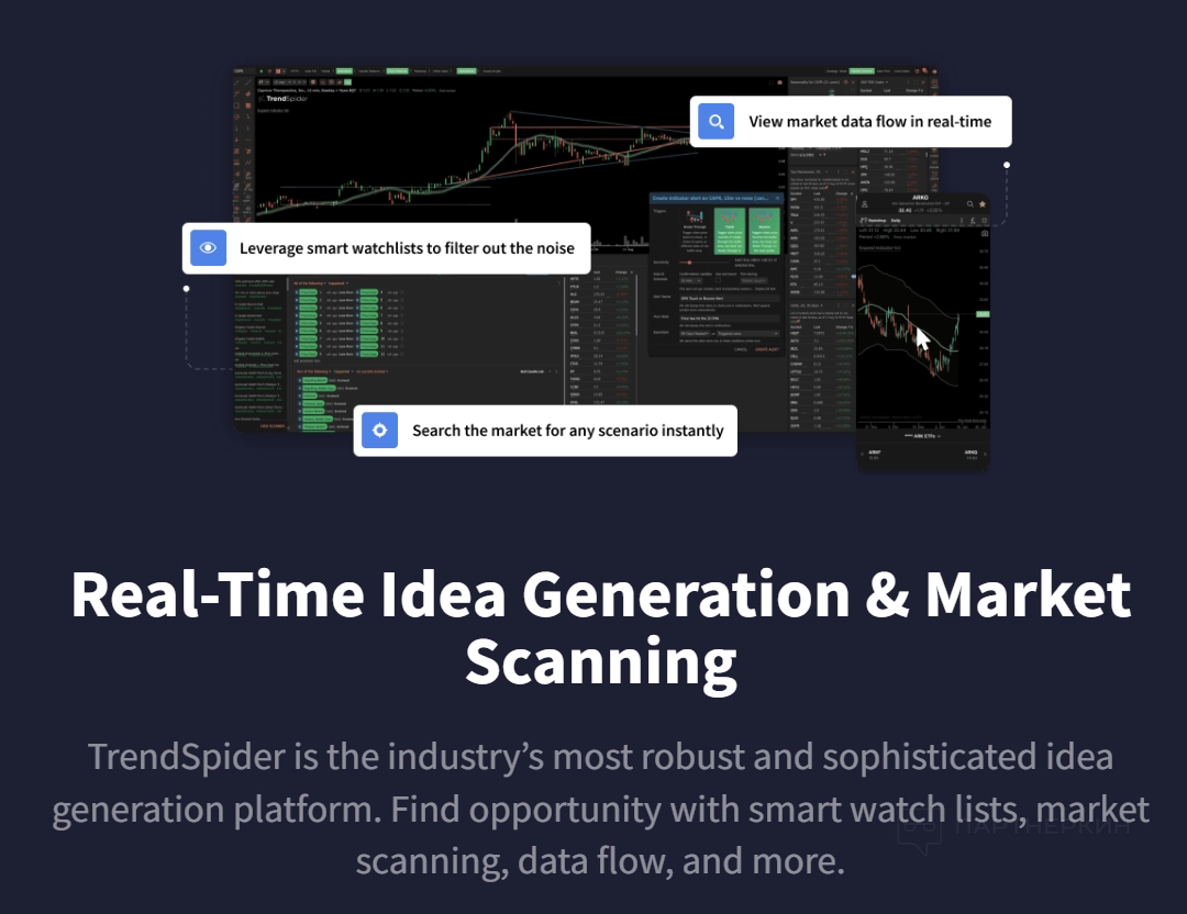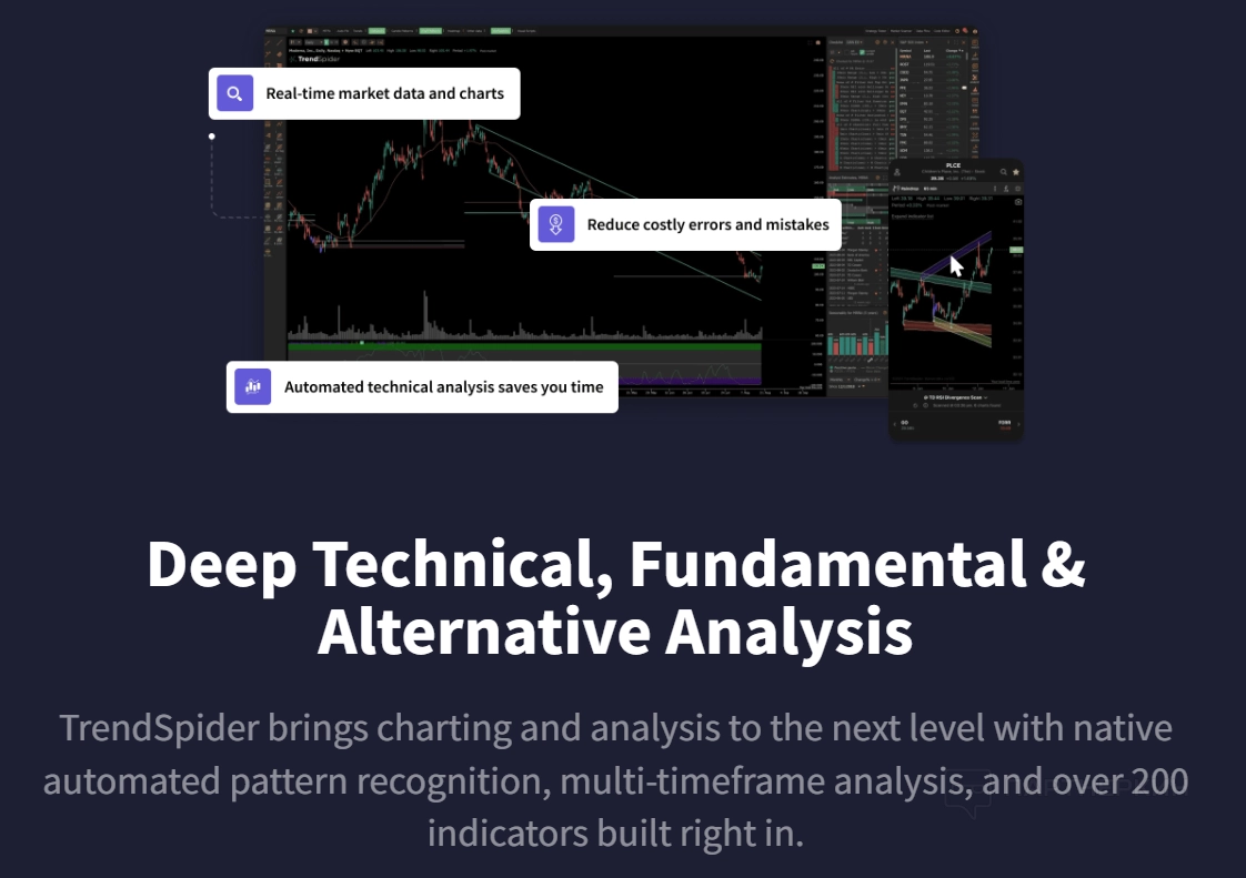 TrendSpiderавтоматически распознает графические паттерны, анализирует японские свечи и предлагает более 190 индикаторов. Автоматическое определение трендов и уровней Фибоначчи, интерактивные графики и тепловые карты помогают глубже изучить рынок. Альтернативные рыночные данные предоставляют дополнительный контекст для анализа.