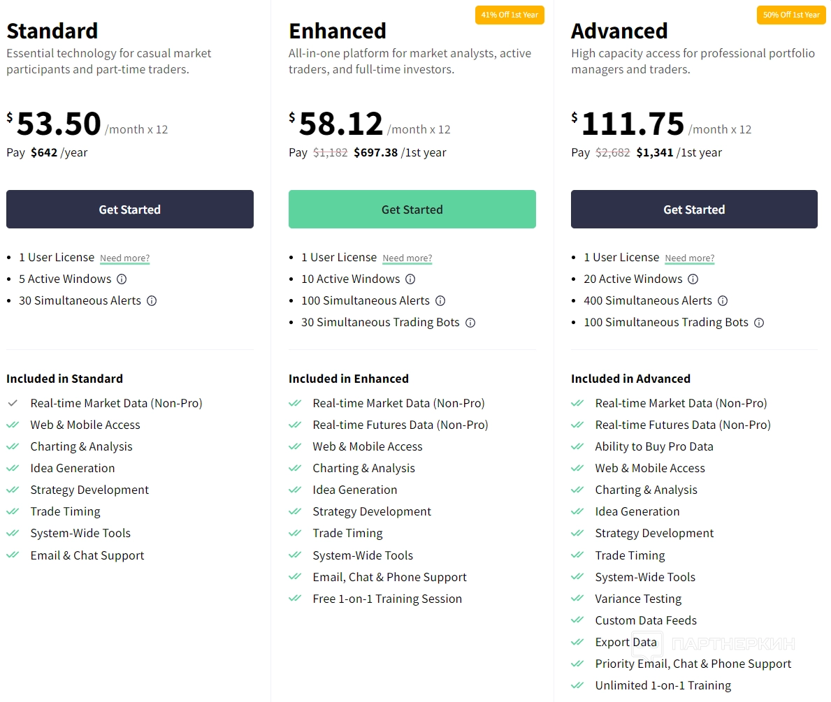 - Enhanced за $58.12 в месяц (при оплате за год —$697.38) предлагает расширенные возможности. Включает одну лицензию, 10 окон, 100 уведомлений и до 30 торговых ботов. Включены данные по фьючерсам, поддержка через телефон и обучение один на один.